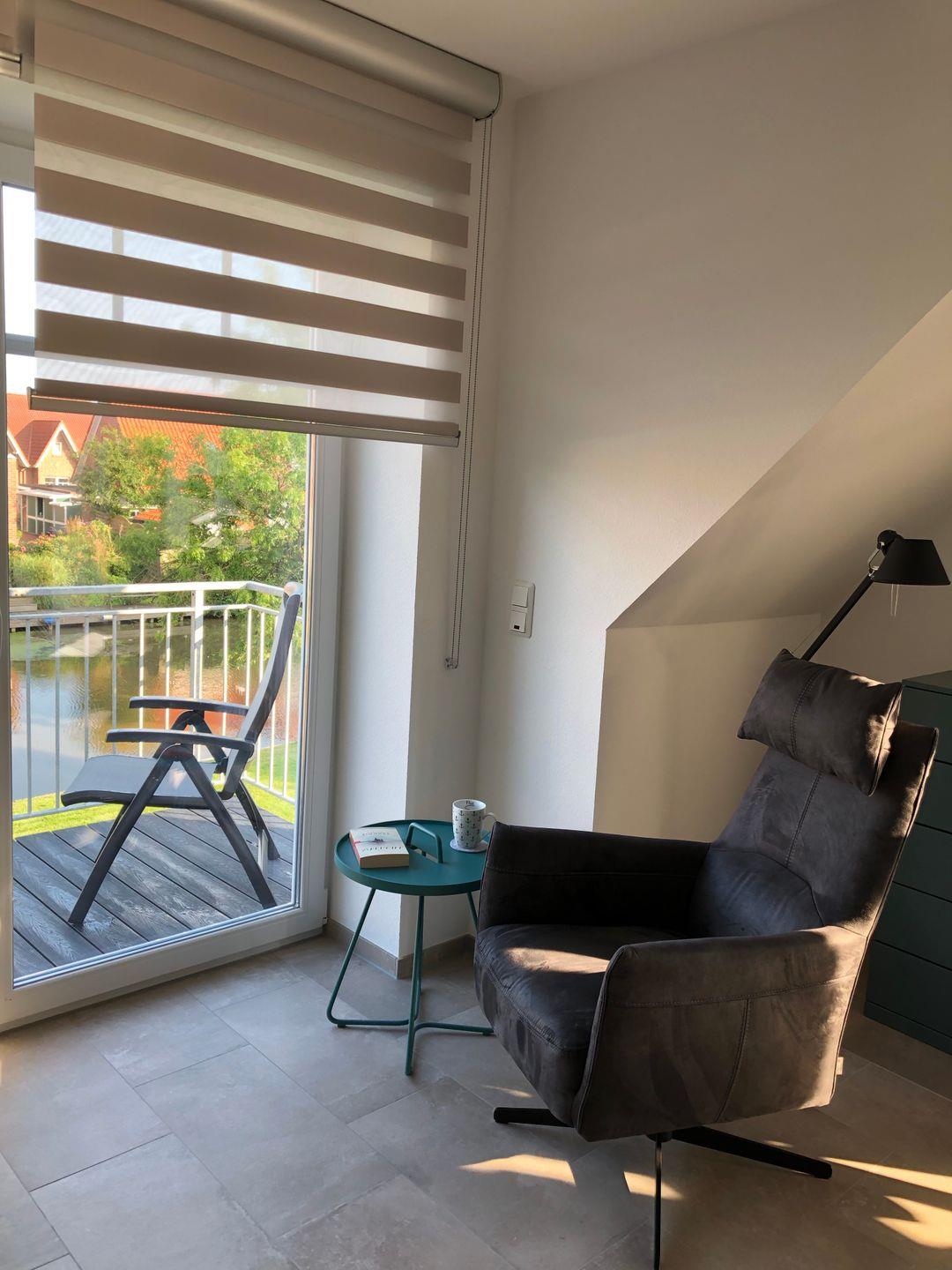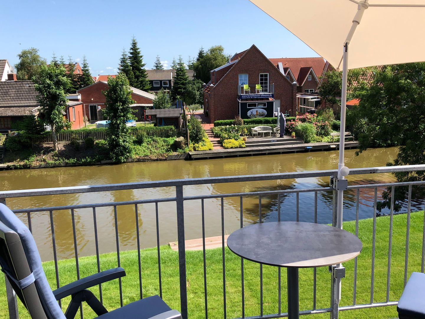 Moderne Maisonette-Ferienwohnung in Greetsiel mit Blick auf Grachten und Park, ideal für Ruhe und Erholung zu zweit.