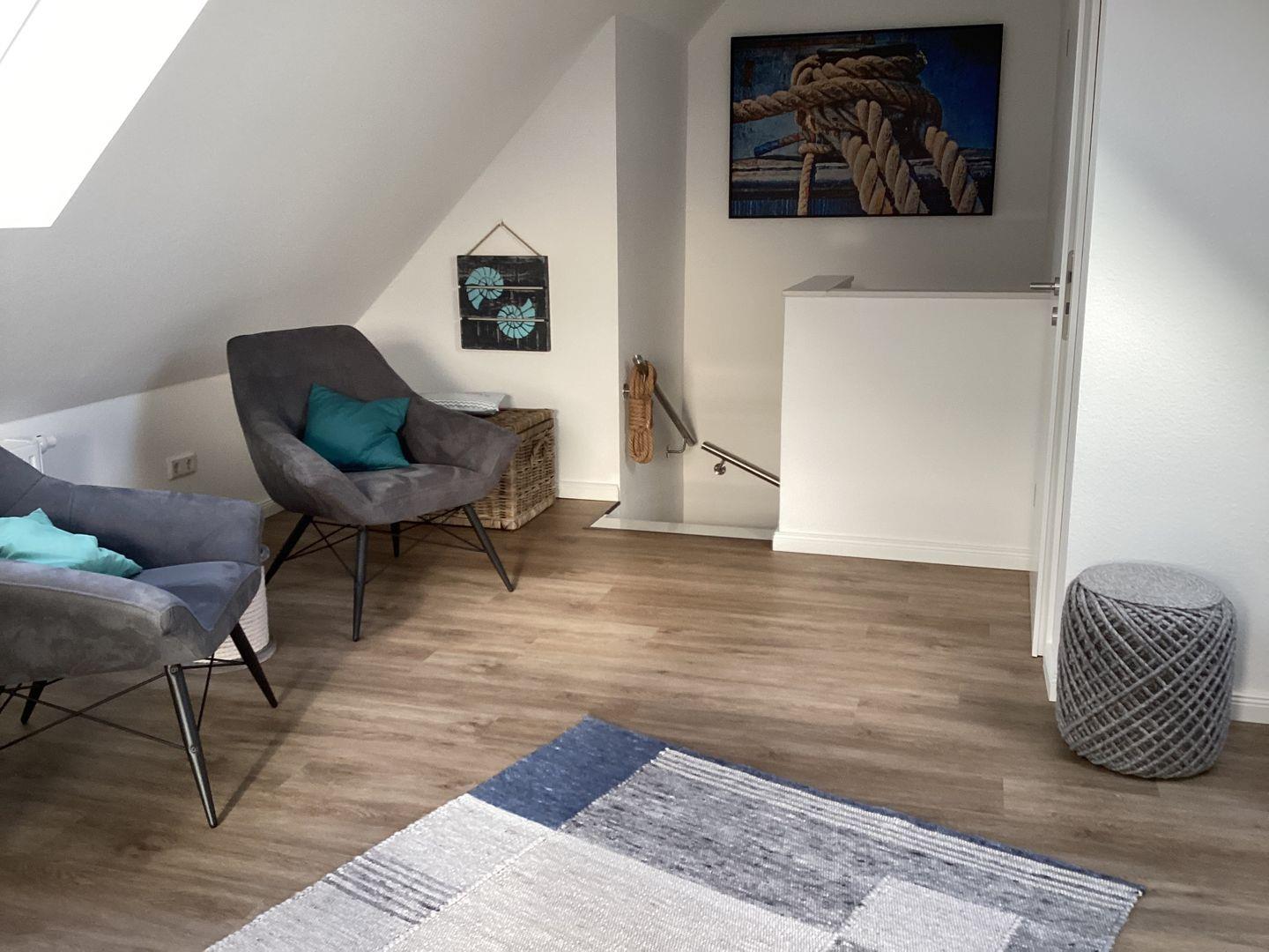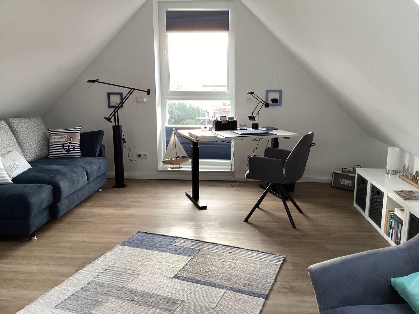 Ebenfalls lichtdurchflutet durch zwei gegenüberliegende Dachfenster sowie ein nach Westen gehendes, bodentiefes Fenster mit Blick auf den Park des Hotels ist das modern und maritim eingerichtete Studio. Dieses kann als weiterer Wohnbereich oder aber auch als Arbeitsplatz für denjenigen, der zwischendurch mobil arbeiten möchte, genutzt werden. Dort finden Sie einen höhenverstellbaren Schreibtisch mit einem Drehsessel, eine bequeme Couch sowie zwei Sessel und einen weiteren Smart-TV.