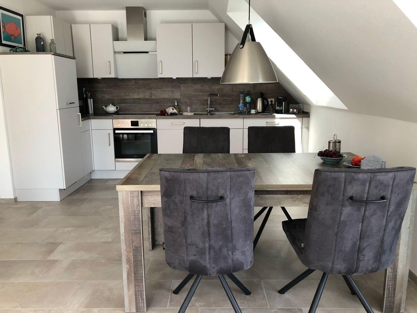 Der durch viele bodentiefe Fenster lichtdurchflutete Wohn- und Essbereich mit Küchenzeile ist modern und mit Liebe zum Detail eingerichtet. Hier finden Sie einen Esstisch mit 5 Sesseln, eine bequeme Sitzecke aus weichem Leder sowie einen gemütlichen Lesesessel mit Blick auf das Wasser. Ein Smart-TV sowie ein Internetradio (DAB und Bluetooth) sind ebenso vorhanden wie einige Bücher für Regentage. Die Küche lässt kaum Wünsche offen und verfügt u.a. über eine leise Geschirrspülmaschine, Induktionsherd mit Umluftbackofen, Mikrowelle, Filterkaffeemaschine, Nespresso-Maschine, Kühlschrank, Wasserkocher, Toaster und Eierkocher. Der Balkon mit Sonne von morgens bis zum späten Nachmittag ist ausgestattet mit 2 klappbaren Sesseln mit Auflagen, einem Tisch und zwei Sonnenschirmen.