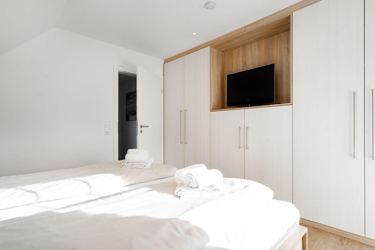 Ebenfalls auf dieser Etage befindet sich ein Schlafzimmer mit einem Doppelbett, einem weiteren Flachbildfernseher und großzügigen Verstaumöglichkeiten für Ihr Gepäck. Angrenzend befindet sich das Duschbad mit ebenerdiger Dusche und großem Dachflächenfenster.