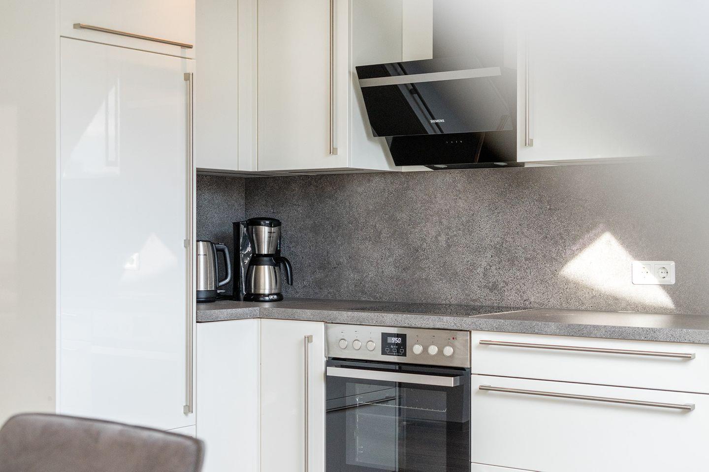 Übergehend befindet sich der Essbereich mit Esstisch, sechs Stühlen und die Küche. Diese ist mit hochwertigen Geräten und Materialien ausgestattet und bietet unter anderem einen Kühlschrank mit Gefrierfach, einen Backofen, einen Herd mit Cerankochfeld und weitere unerlässliche Küchenutensilien.