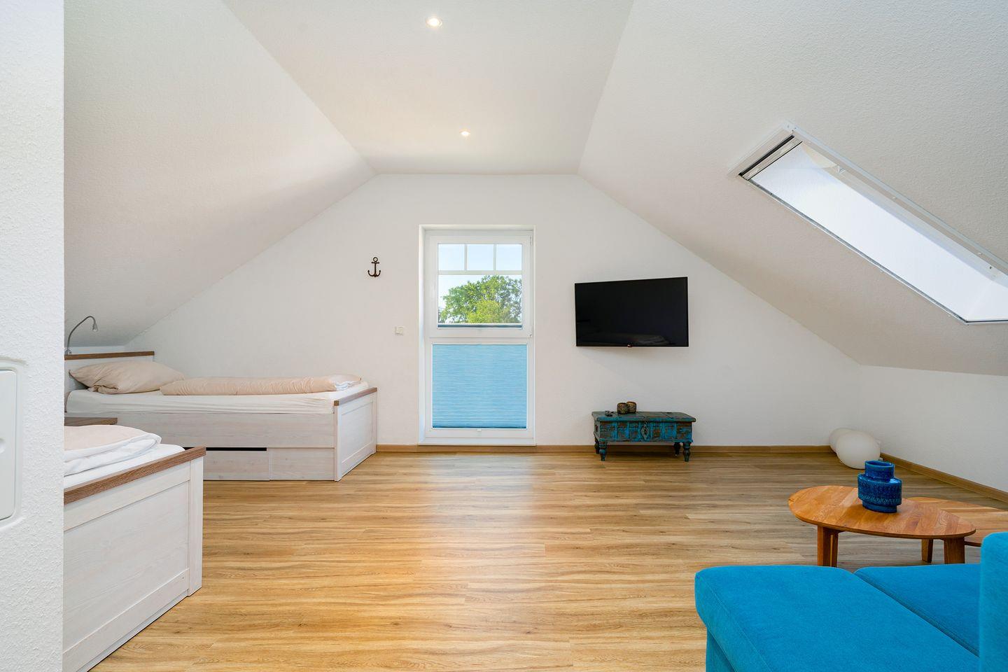 Vom Wohnbereich führt eine Treppe in das ausgebaute Dachgeschoss. Hier finden Sie ein 2. Duschbad mit Föhn, eine begehbare Kleiderkammer und das großzügige Dachstudio mit 2 Einzelbetten und ausziehbarem Schlafsofa (140x200).