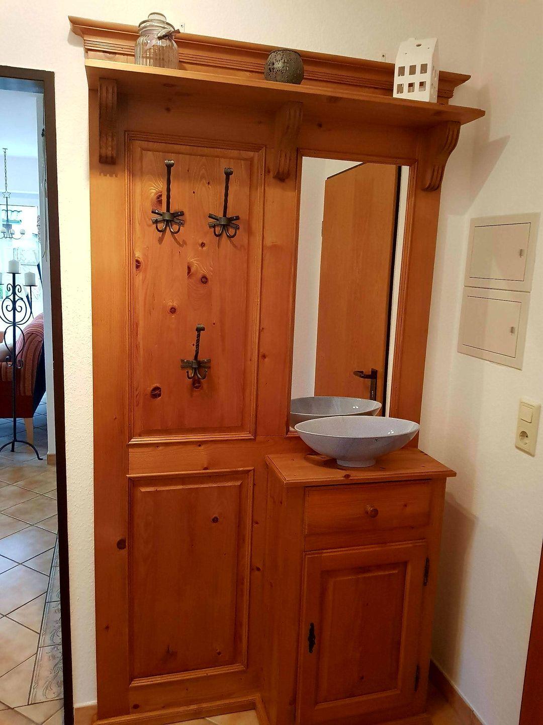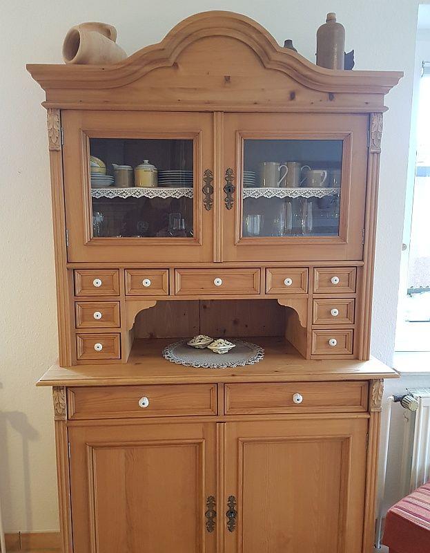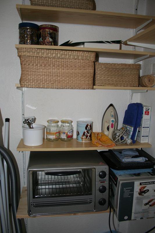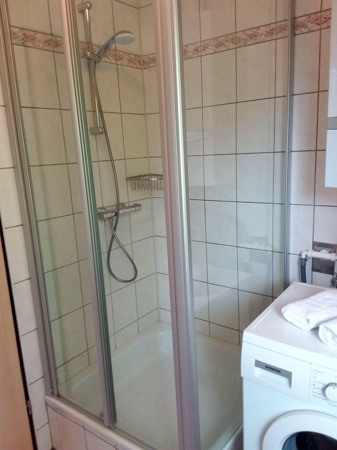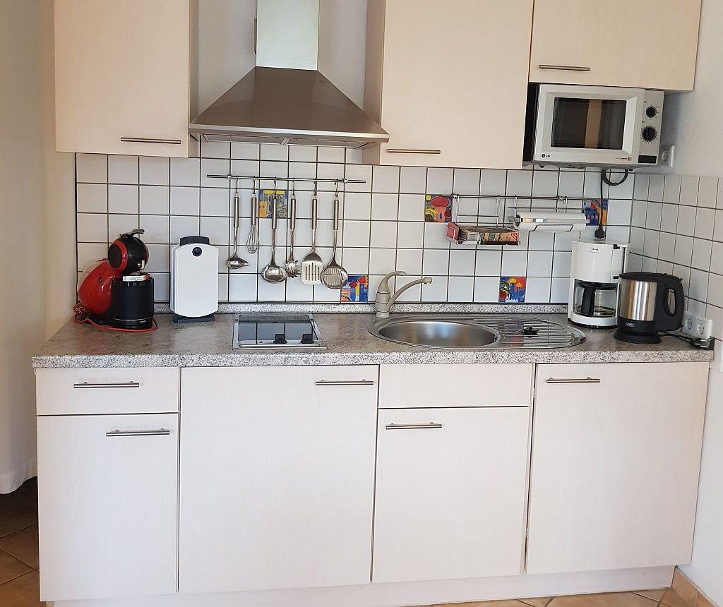 Einbauküche mit Mikrowelle, Gefrierkombination, Kaffeemaschine, eine Kapsel-Kaffeemaschine (Senseo), Wasserkocher, Toaster u.v.m., ein Bad mit Dusche und Waschmaschine. Ein kleiner Backofen ist vorhanden.