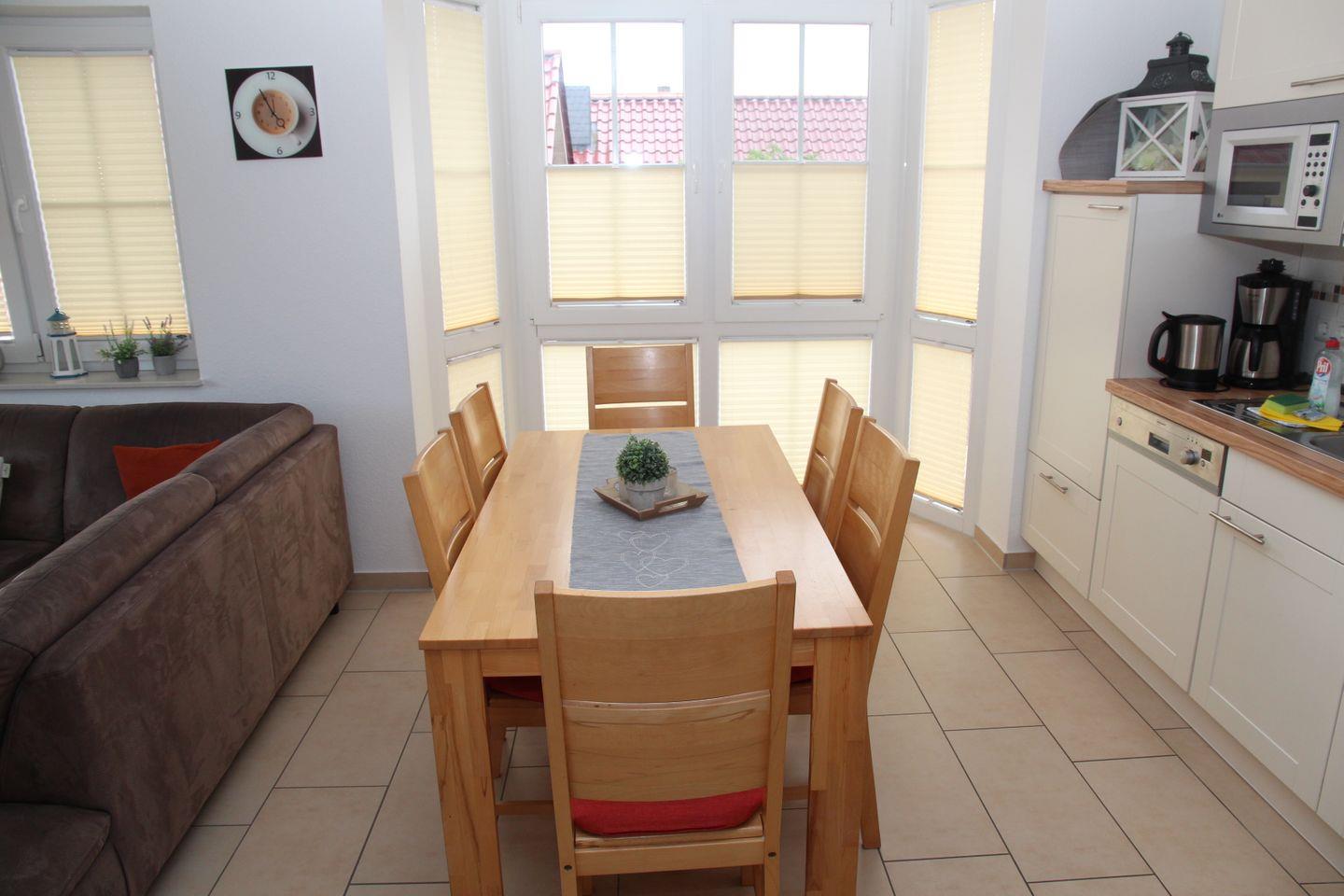Eine Schattierung der Fenster ist durch Plisseerollos gewährleistet. Die FEWO hat einen schönen möblierten Balkon. Einen Abstellraum für mitgebrachte Fahrräder gibt es ebenso.
