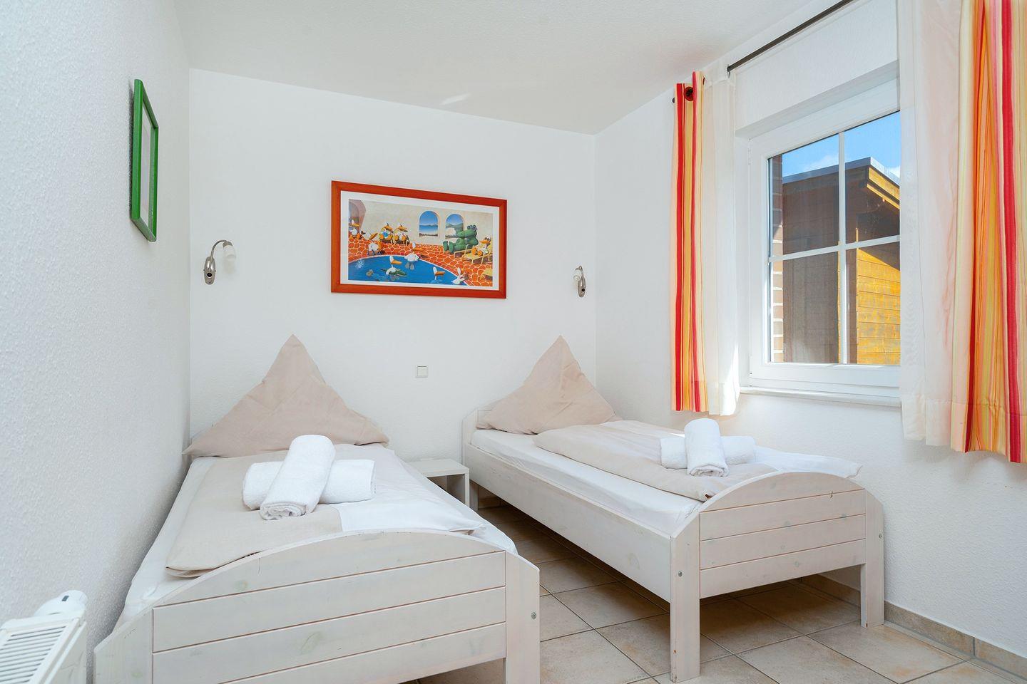 Fliegengitter gibt es in den Schlafräumen, in zwei Erkerfenstern sowie vor der Terrassentür.