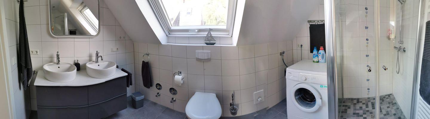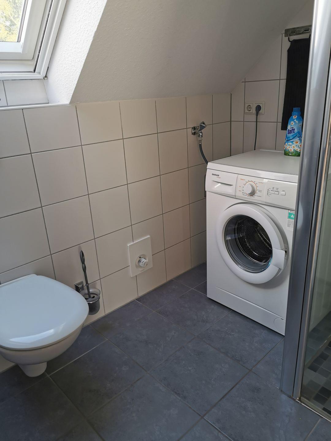 Großes Duschbad (ohne Duschwanne) mit WC, Waschmaschine, Handtuchwärmer und Föhn und Fliegengitter vor dem Veluxfenster.