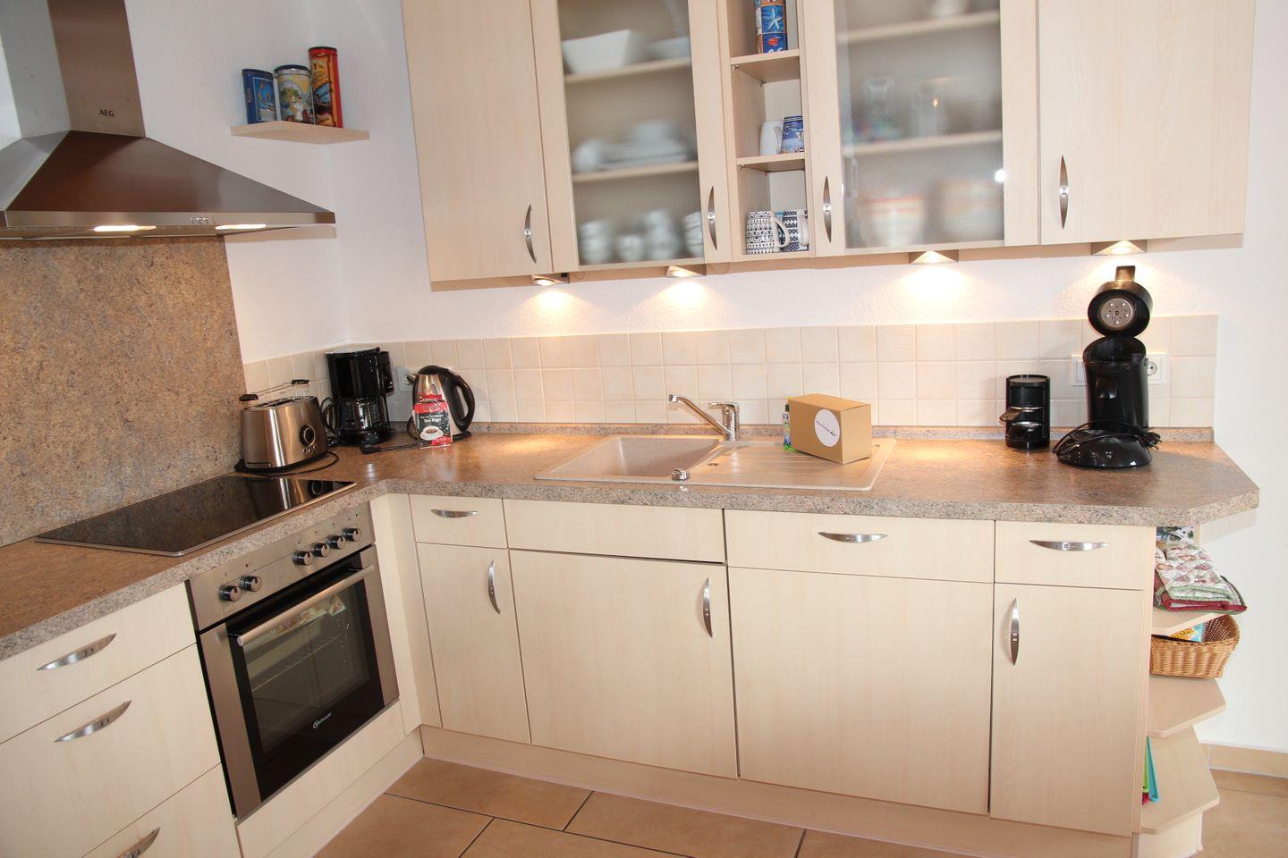 Die hochwertig ausgestattete Küche lässt ebenfalls keine Wünsche offen und verfügt über einen Geschirrspüler, Mikrowelle, Kühl-Gefrierkombination, Toaster, Sandwich-Toaster, Wasserkocher, Eierkocher, Pürierstab, Senseo, Kaffeemaschine, Backofen.