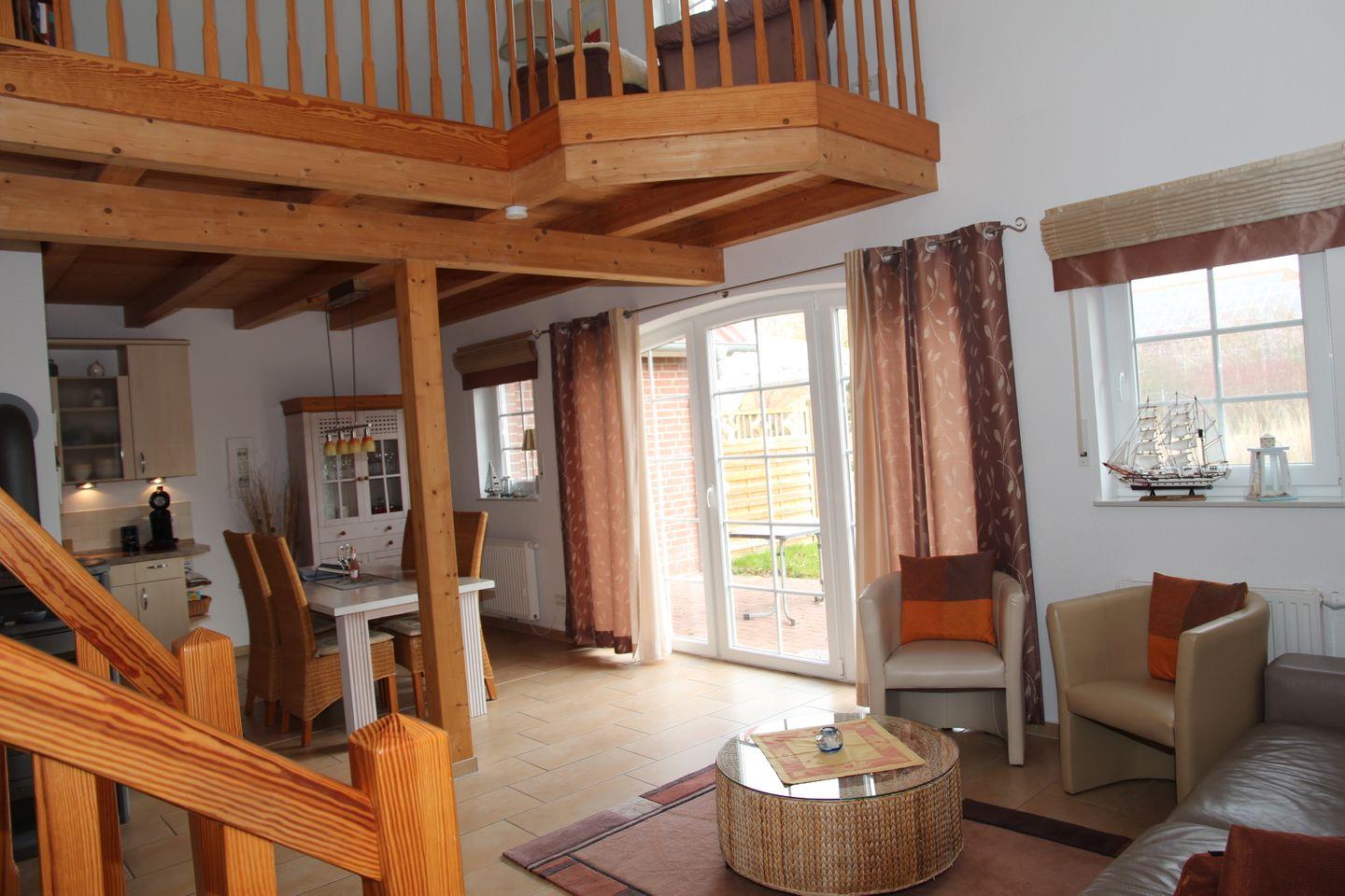 Die "Friesenperle", mit viel Liebe zum Detail eingerichtet, verfügt über 2 Schlafzimmer (komplette neue Matratzen im März 2025) und 2 Badezimmer, einen großen Wohn-Essbereich mit Kamin und eine kuschelige Leseecke mit Musikanlage auf der Galerie. Die rustikale Holzbalkendecke gibt dem Haus eine warme Atmosphäre.