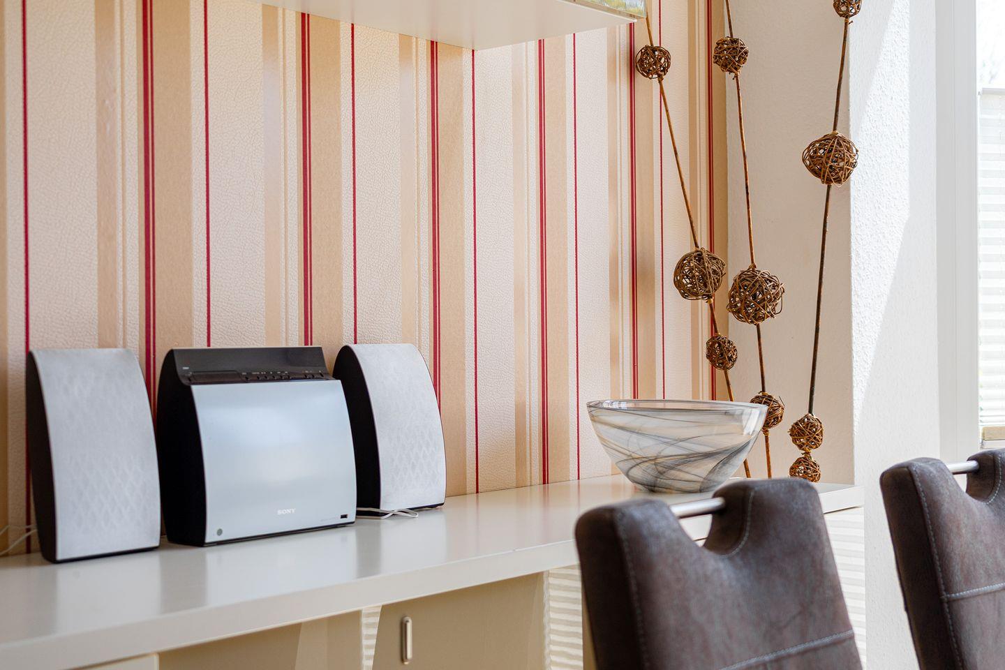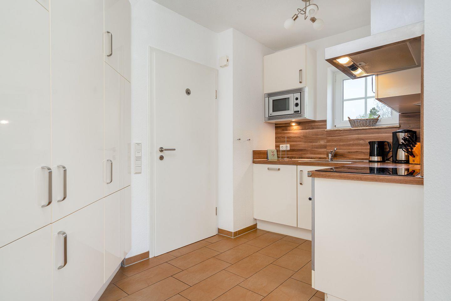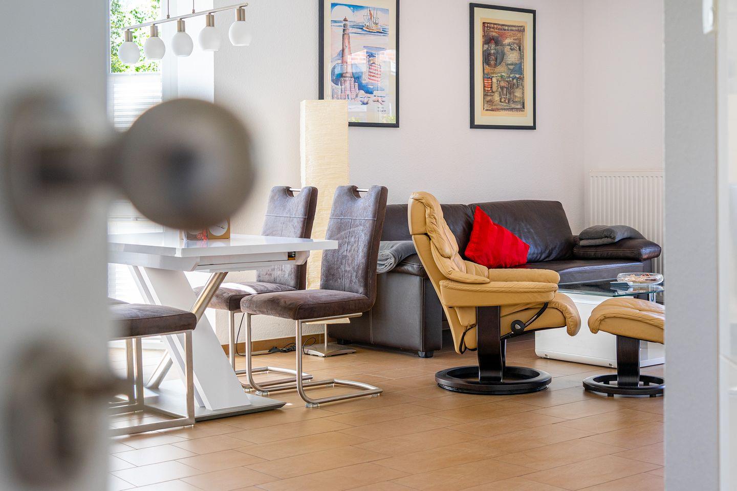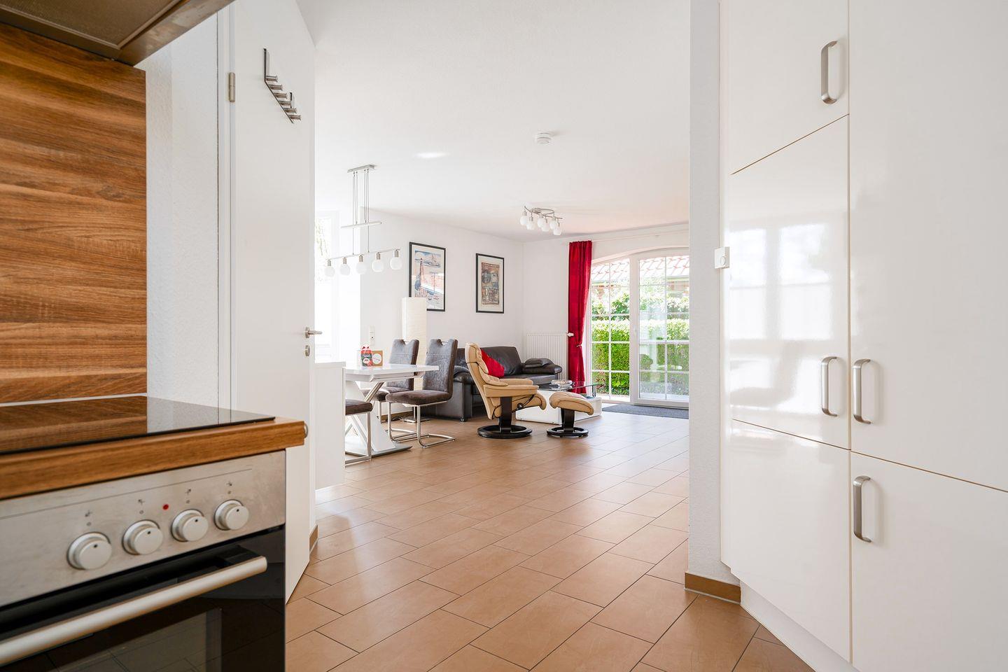 Großer Wohn-/Essbereich mit voll ausgestatteter Küche z. B. Mikrowelle, Backofen, Spülmaschine, Cerankochfeld, Kühlschrank mit Gefrierfach, Kaffeemaschine, Toaster, Eierkocher, Wasserkocher, Mixer u.v.m.