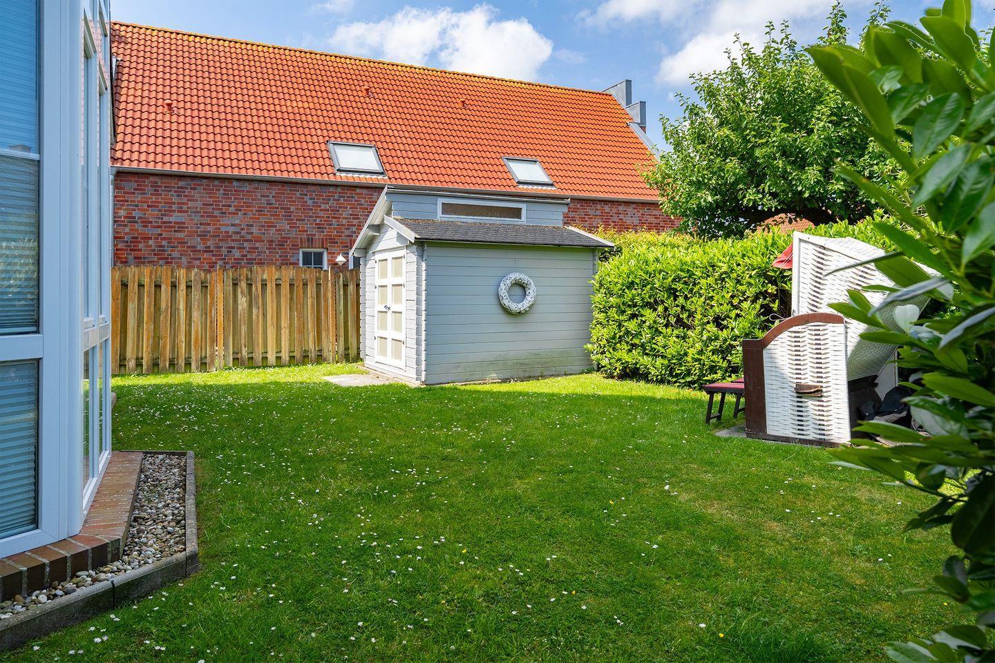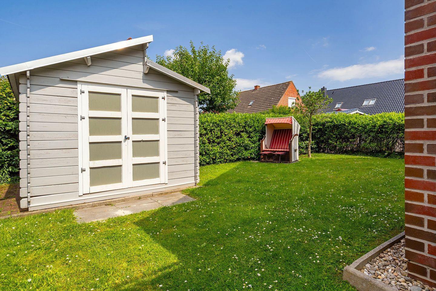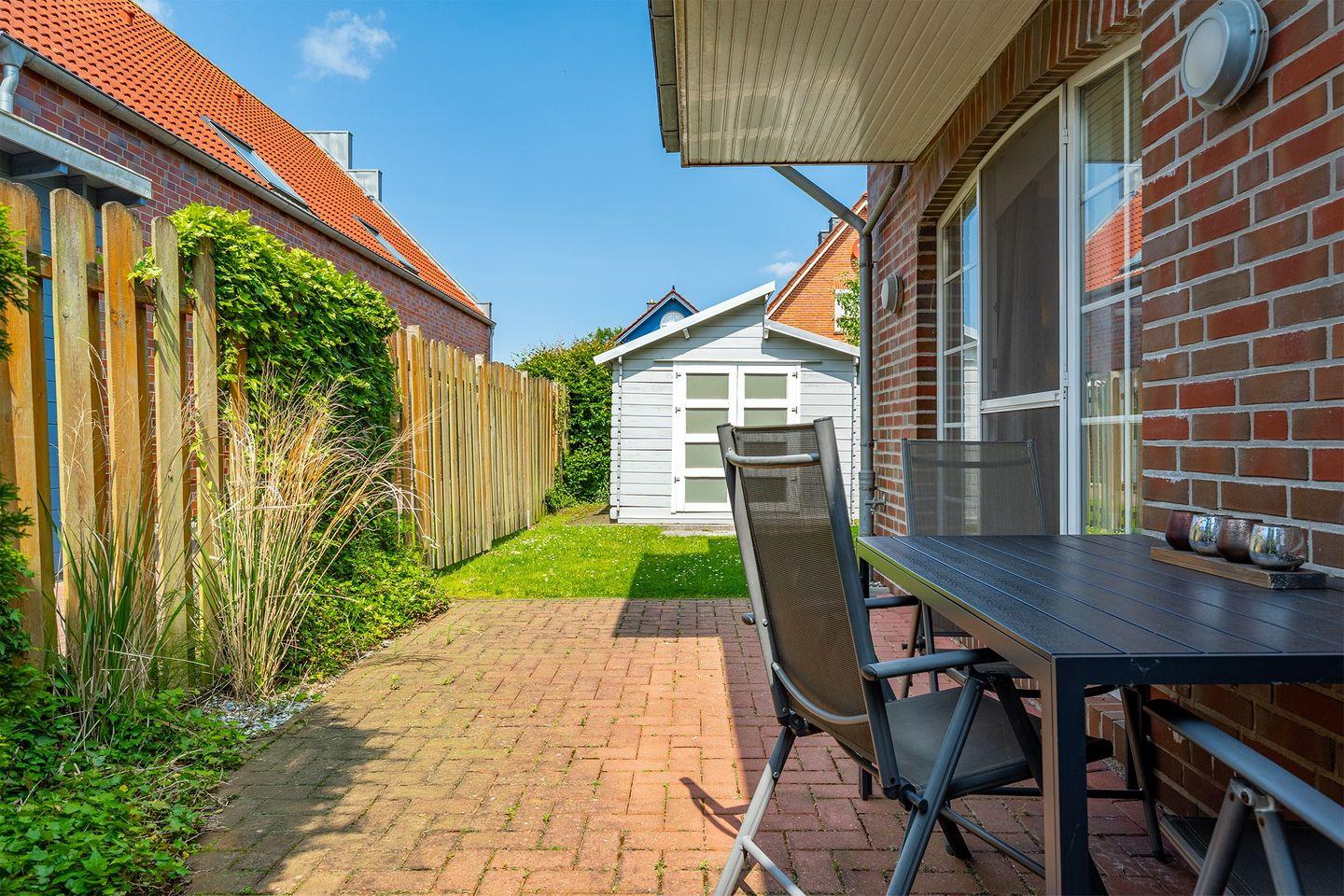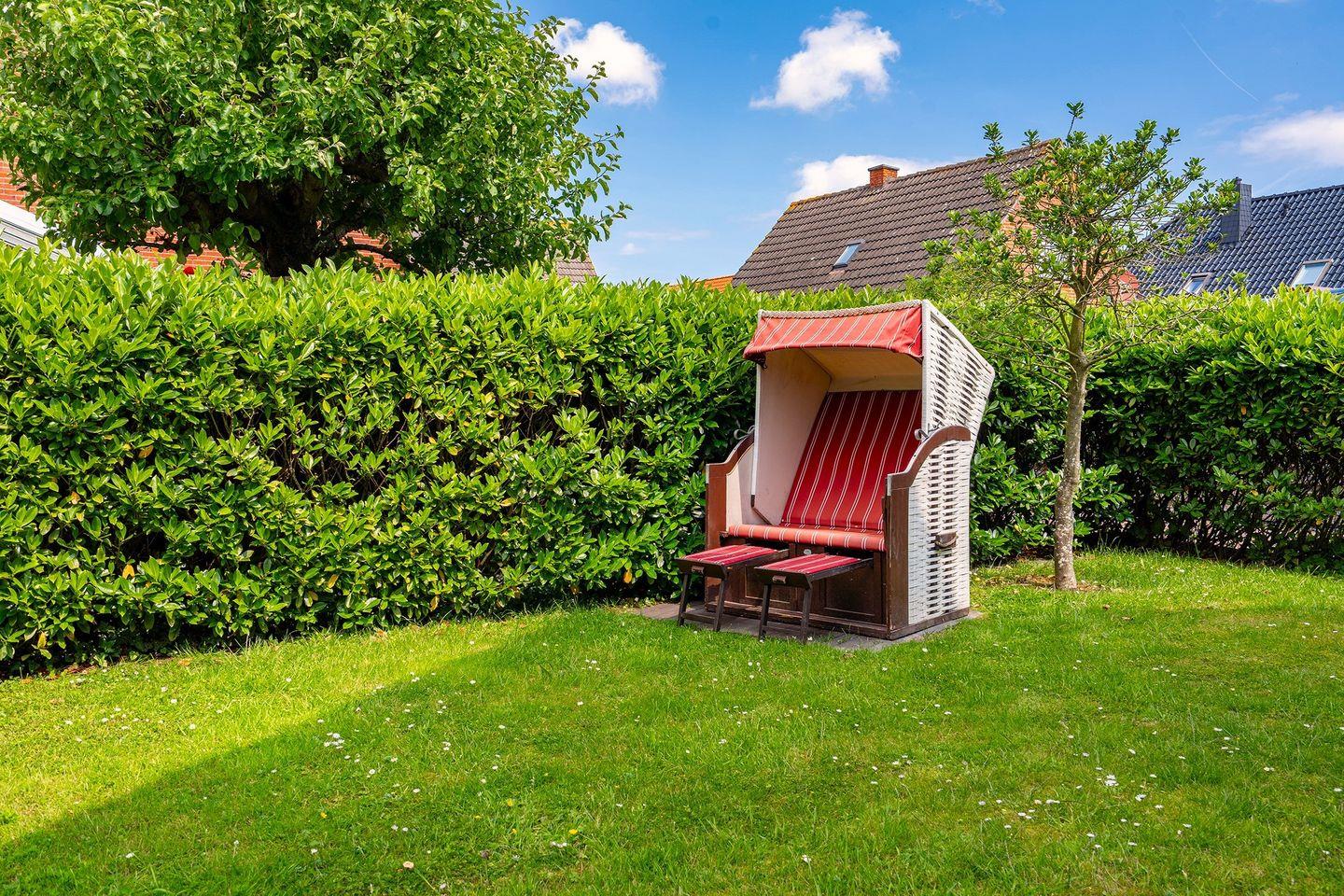 Ein kleiner Garten mit gemütlicher Terrasse, Grill und einem Strandkorb für die Sonnenstunden, laden zu einem erholsamen Urlaub ein.