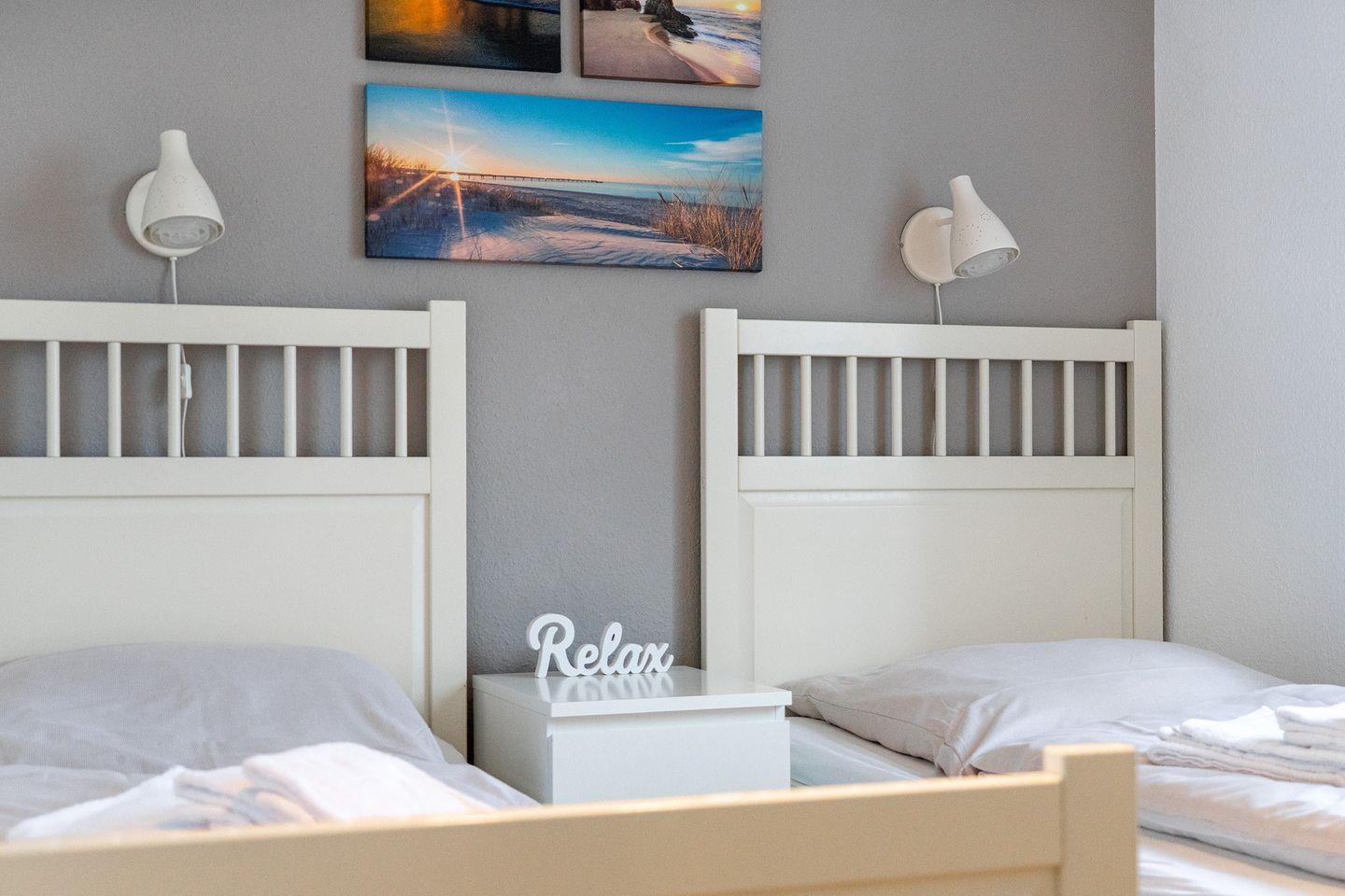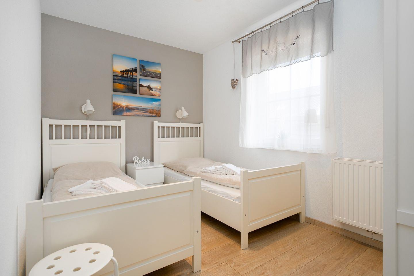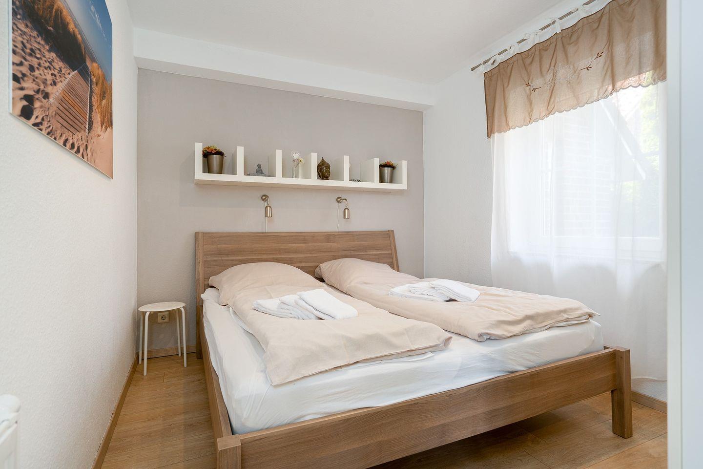 Es gibt zwei gemütliche Schlafräume, 1 x mit Doppelbett und 1 x mit zwei Einzelbetten (Außenrollos), ein modernes Bad mit Dusche (ohne WC) und großem Doppelwaschtisch, sowie ein separates WC.