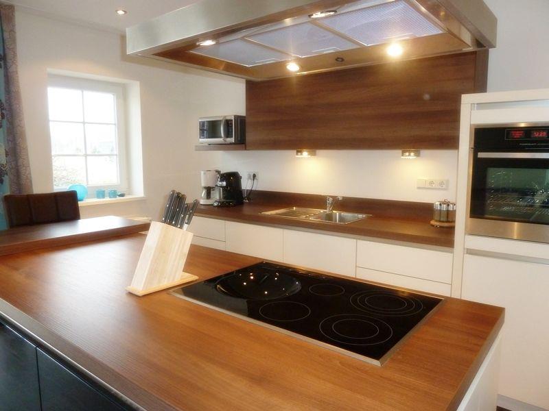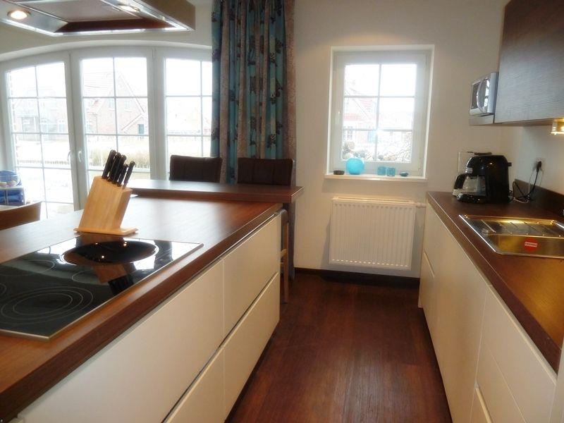 Die hochwertig ausgestattete Küche (Ceranfeld, Kühlschrank, Gefrierschrank, Wasserkocher, Kaffeemaschine, Toaster, Eierkocher, Mixer) mit Kochinsel und separater Wokmulde lädt bei traumhaftem Blick auf die Gracht zum gemeinsamen Kochen und Verweilen ein. Der Kaminofen im Wohn- Essbereich trägt zusätzlich zur Gemütlichkeit bei.