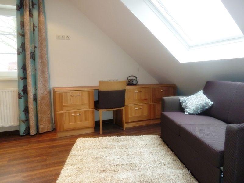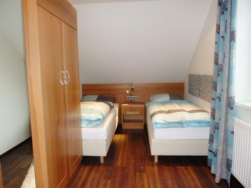 Im Obergeschoss befindet sich ein gemütliches Einzelzimmer mit 1,20 m Bett , 1 Schlafzimmer mit Doppelbett 1,80 m. und ein großes Schlafzimmer mit 2x0,90 m Einzelbetten und 1 sep. Schlafcouch, Schreibtisch, Brettspiele, Bücher. Bei schlechtem Wetter haben Sie hier ein zweites Wohnzimmer. Ein weiteres Schlafzimmer mit einem Doppelbett 1,80 m befindet sich im Erdgeschoss. Alle Betten sind mit Boxspringmatratzen ausgestattet.