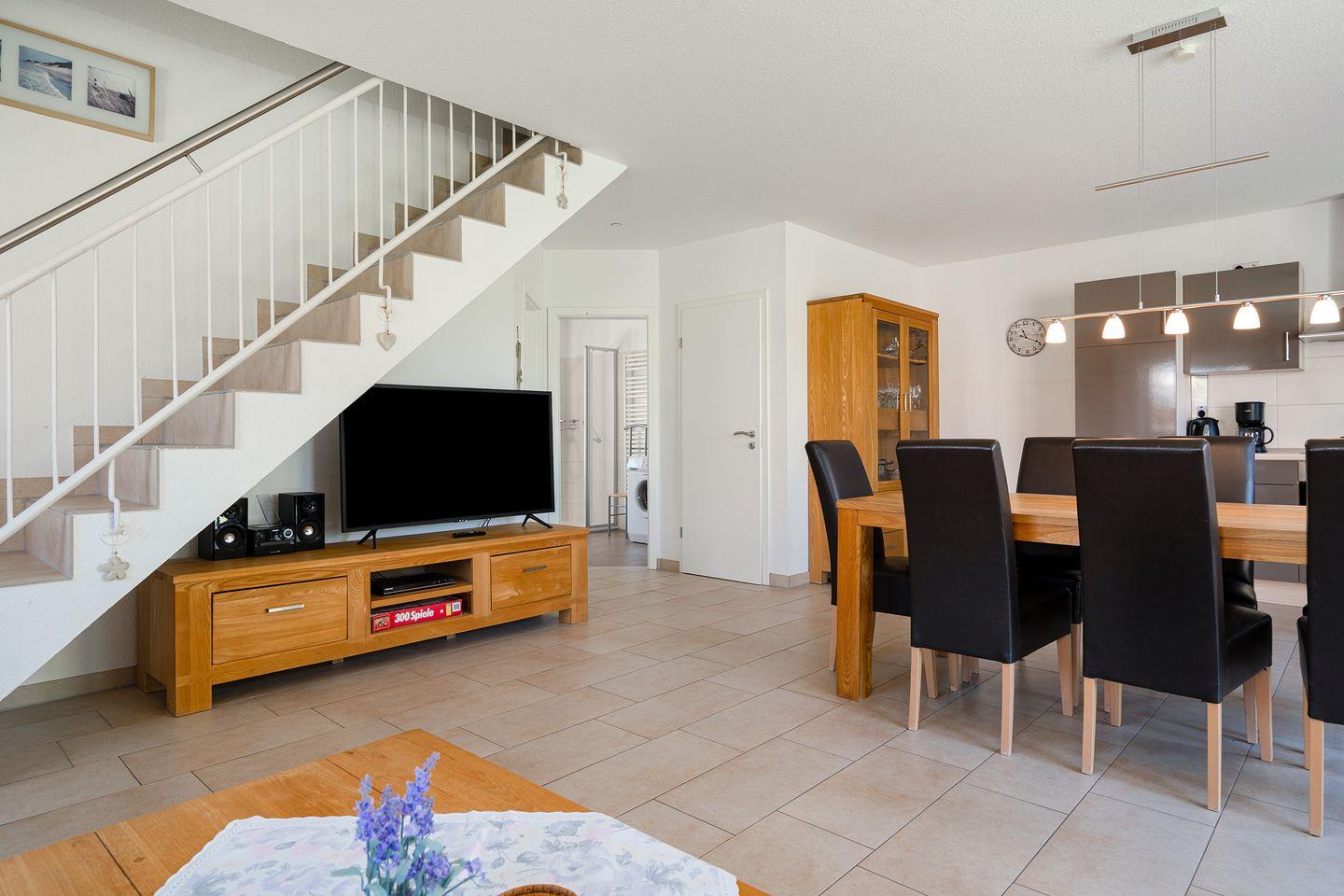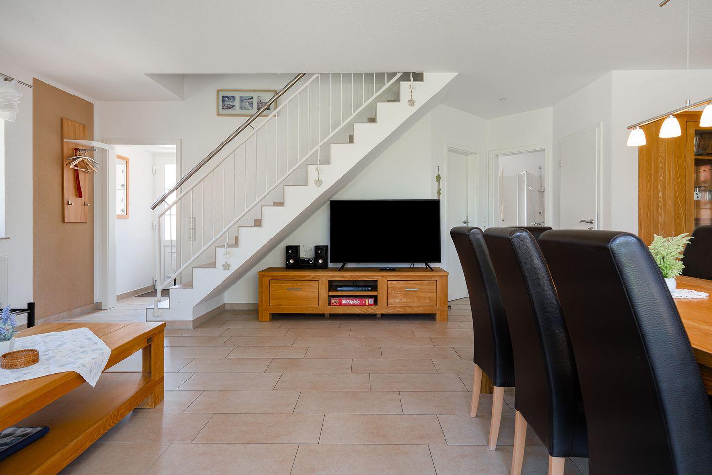 Das Erdgeschoss ist komplett gefliest und verfügt über Fußbodenerwärmung. Das große lichtdurchflutete Wohn-Esszimmer ist geschmackvoll eingerichtet. Die Küche verfügt über eine Geschirrspülmaschine, Kaffeemaschine, Senseomaschine, Wasserkocher, Toaster, Mikrowelle, Eierkocher, Backofen, Kühlschrank mit großem Gefrierfach, Pürierstab, Backformen u.v.m.