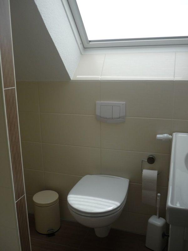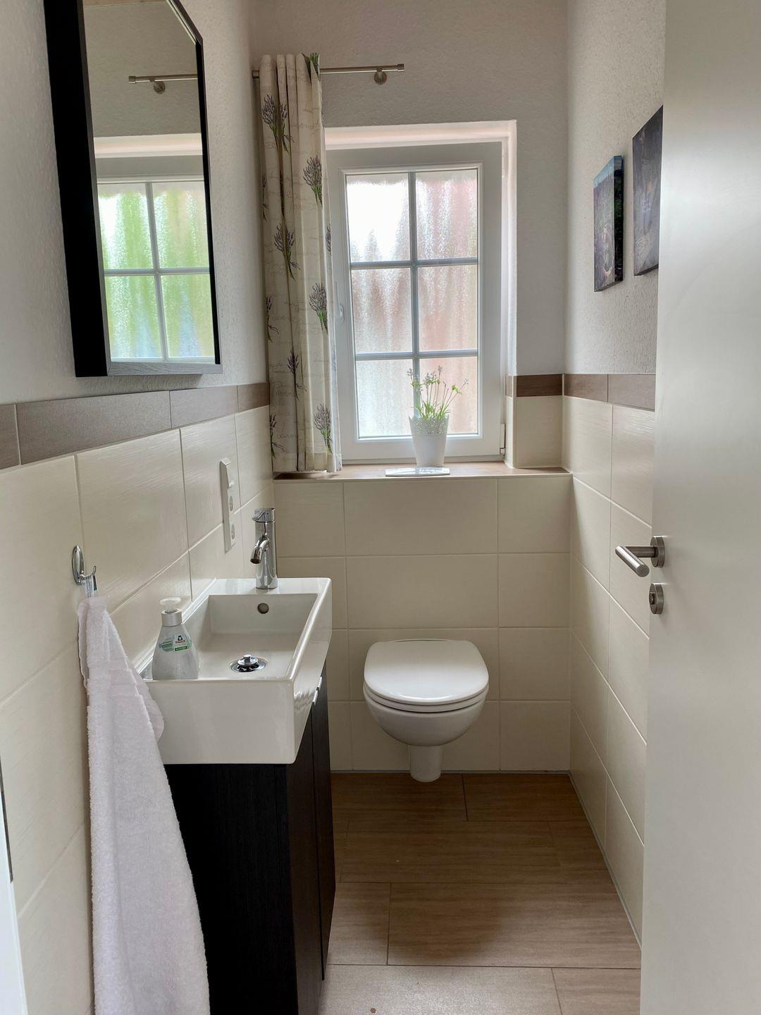 Des Weiteren befinden sich im Erdgeschoss ein Gäste-WC und ein Abstellraum mit Waschmaschine, Trockner, Wäscheständer, Bügelbrett und Bügeleisen.
