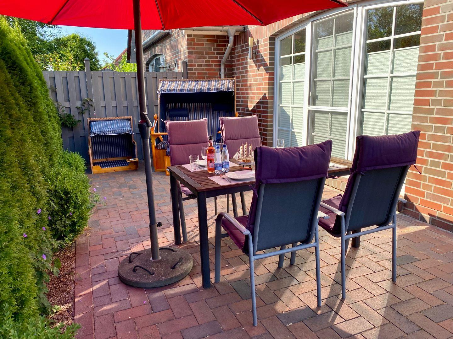 Die große gemütliche Terrasse in Südausrichtung mit Mühlenblick lädt zu Sonnenstunden ein und ist mit Gartenmöbeln und großem Sonnenschirm ausgestattet. Direkt an die Terrasse grenzt der liebevoll angelegte, komplett umzäunte Garten mit weitläufiger Rasenfläche.