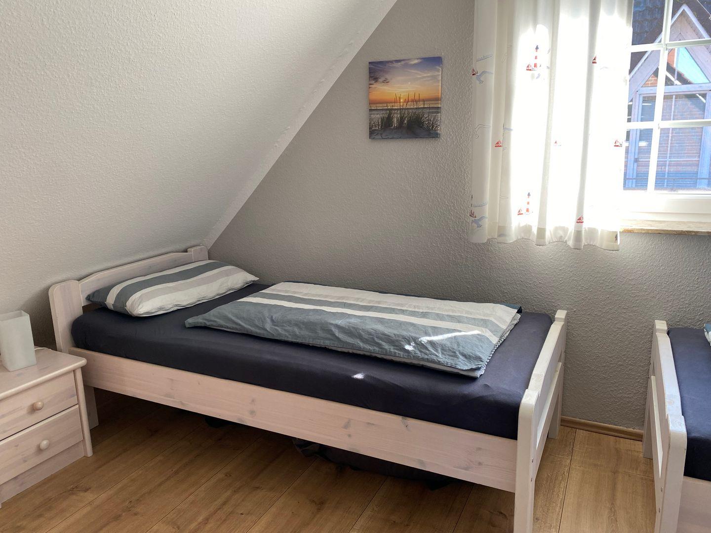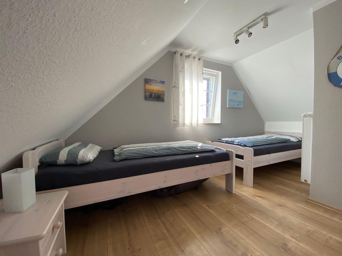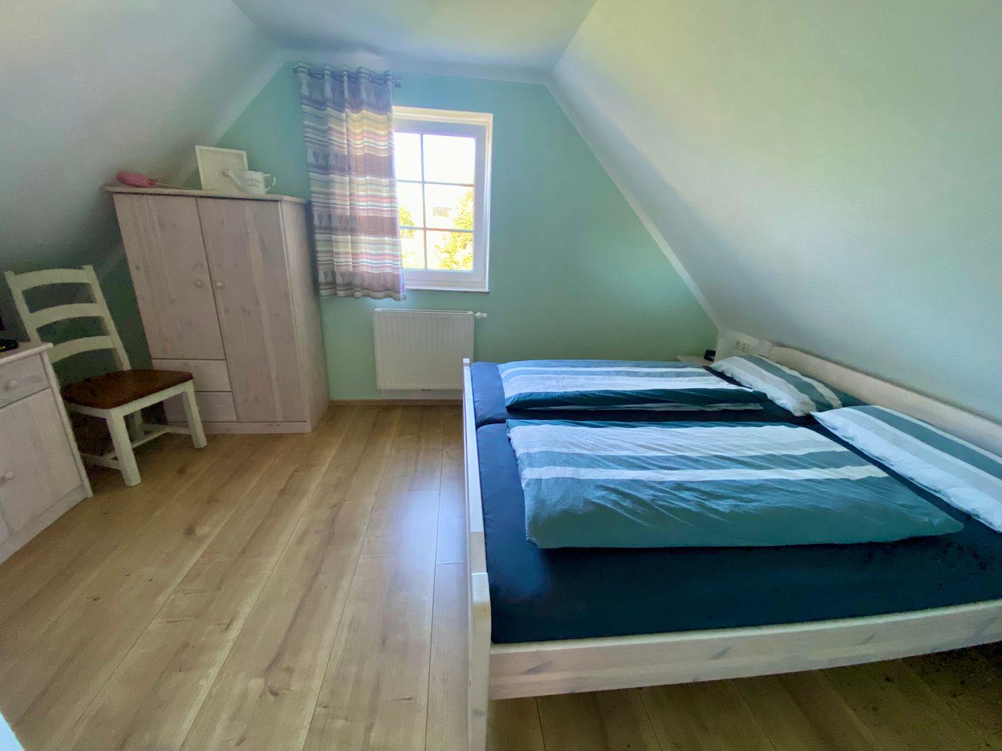 Im Obergeschoss ist das Haus mit zwei Schlafzimmern, 1 Doppelbett und 2 Einzelbetten (90 x 200) und einem Laminatboden eingerichtet. Ein zweites Flat TV (32 Zoll) steht im Schlafzimmer zur Verfügung. Das Bad verfügt über eine Dusche mit niedrigem Einstieg, Fön, vielen Ablagemöglichkeiten und ist mit einem großen Velux-Fenster (mit Sonnenschutz) ausgestattet.