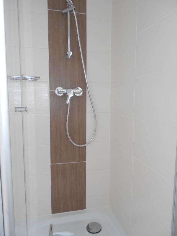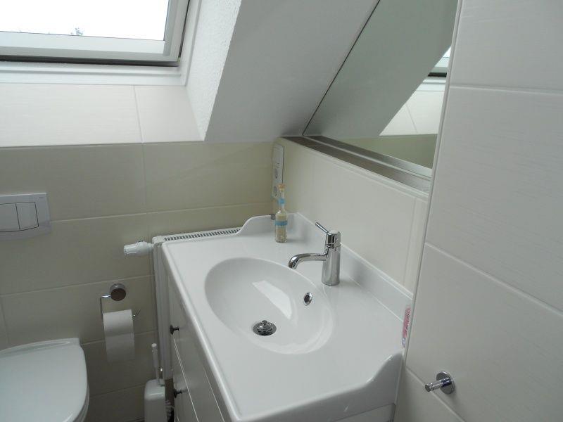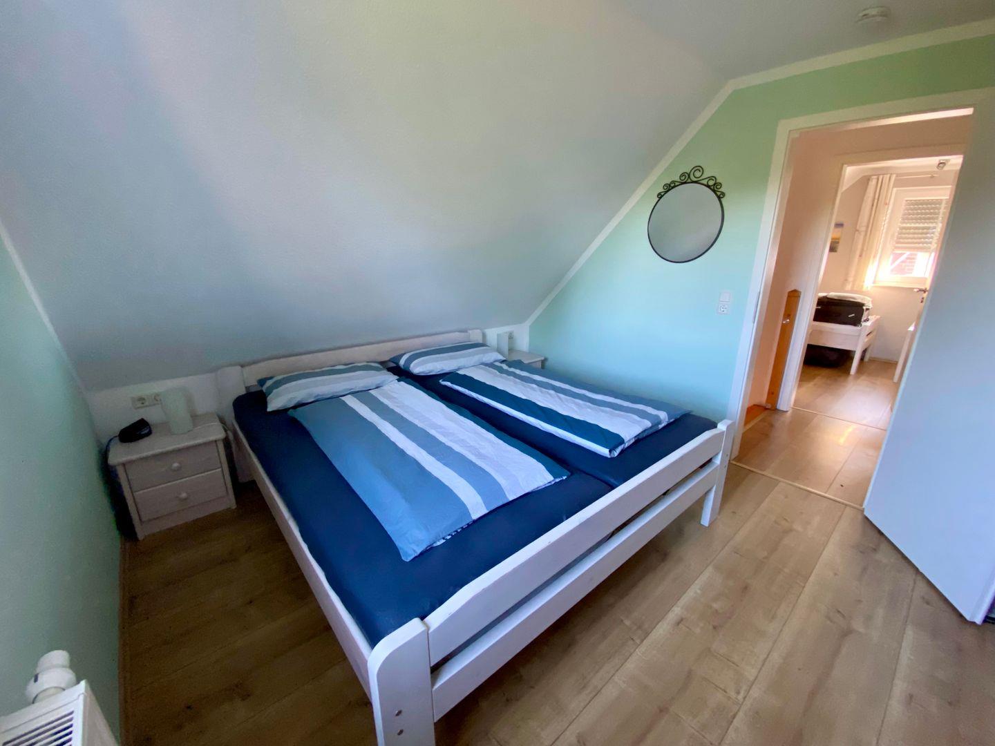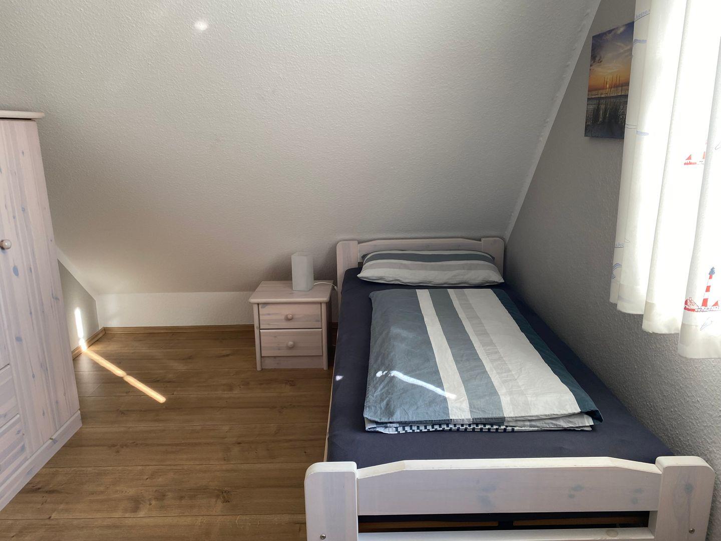 Im Obergeschoss ist das Haus mit zwei Schlafzimmern, 1 Doppelbett und 2 Einzelbetten (90 x 200) und einem Laminatboden eingerichtet. Ein zweites Flat TV (32 Zoll) steht im Schlafzimmer zur Verfügung. Das Bad verfügt über eine Dusche mit niedrigem Einstieg, Fön, vielen Ablagemöglichkeiten und ist mit einem großen Velux-Fenster (mit Sonnenschutz) ausgestattet.