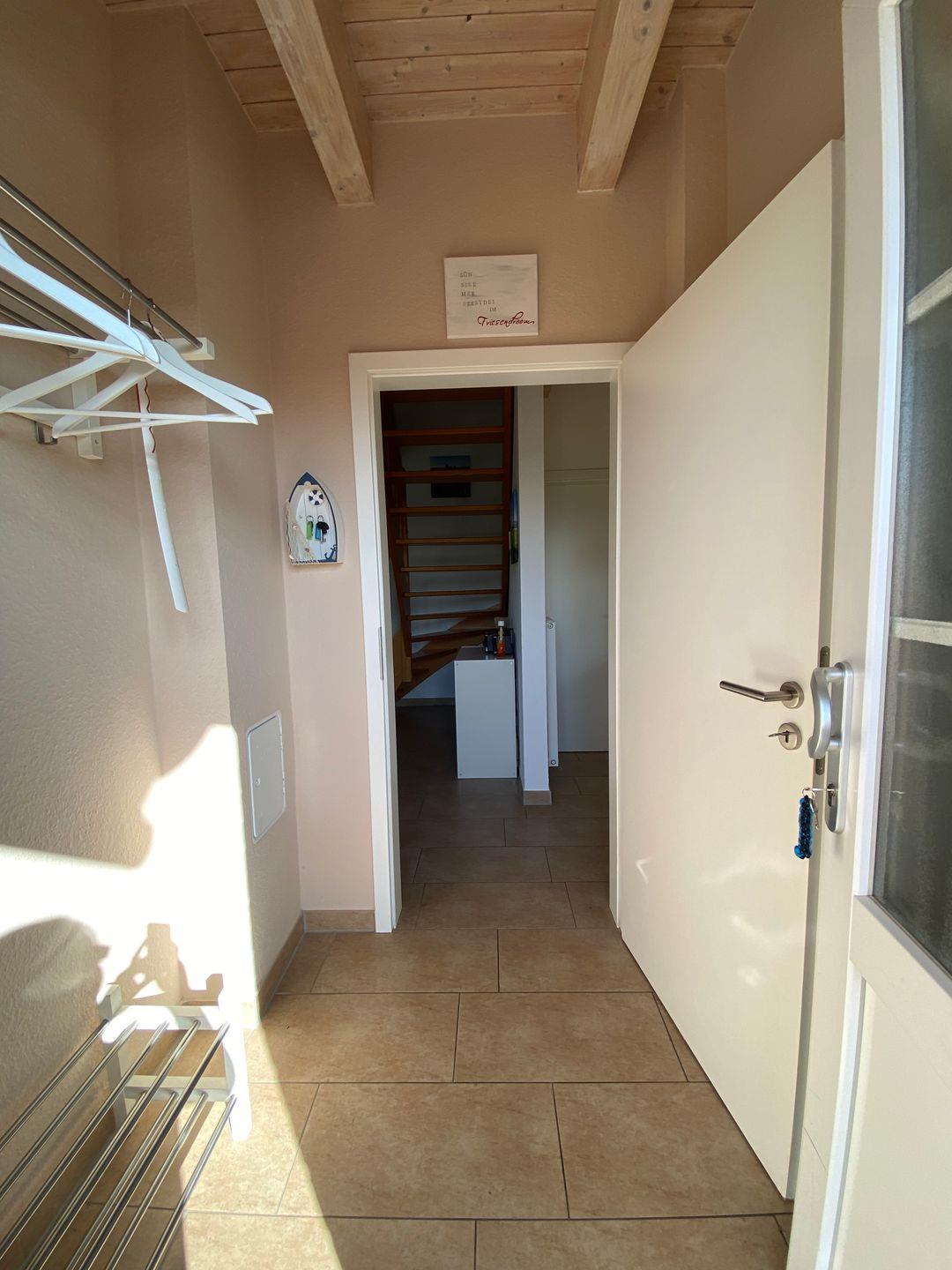 Das Erdgeschoss ist komplett gefliest und mit einer Fußbodenerwärmung ausgestattet. An kühlen Tagen sorgt der Kaminofen für wohlige Wärme im gemütlichen Wohn-Essbereich mit Holzbalkendecke. Flat-TV (46 Zoll), Stereo-Anlage mit MP3 und USB-Anschluss sowie ein DVD-/Blu ray-Player gehören hier zur Einrichtung.