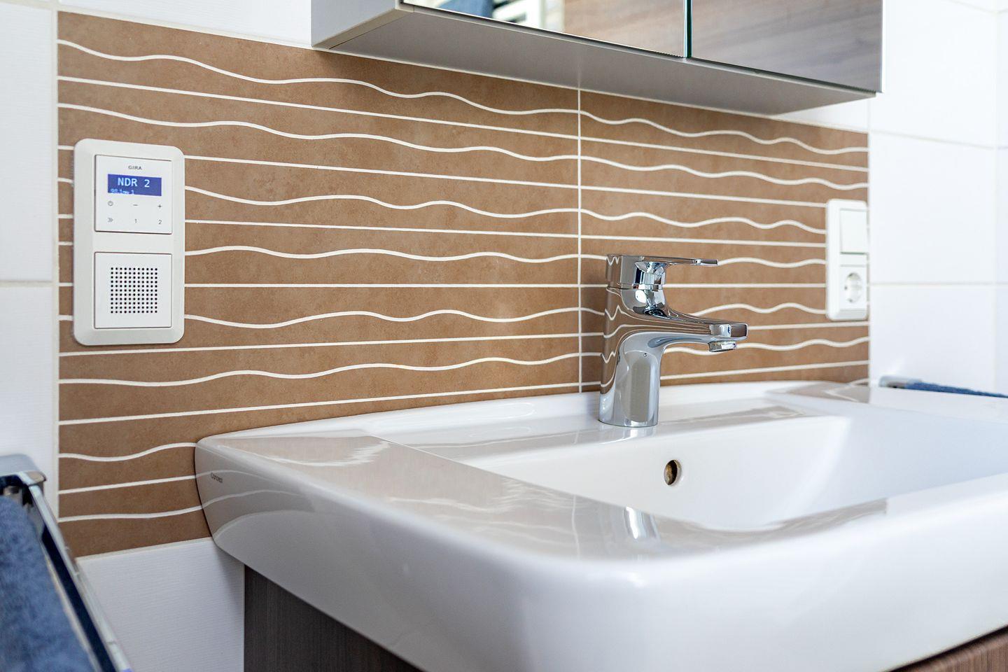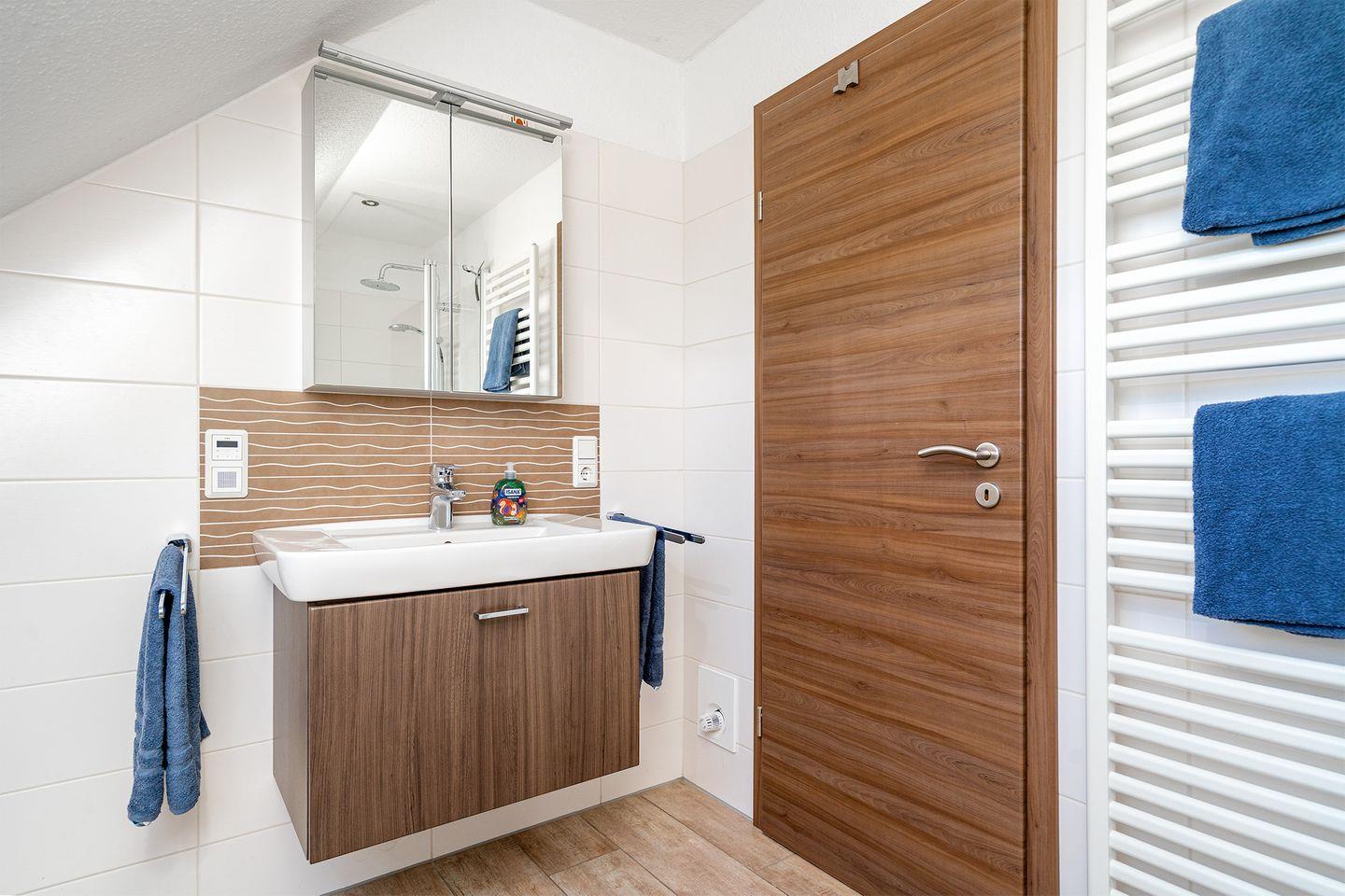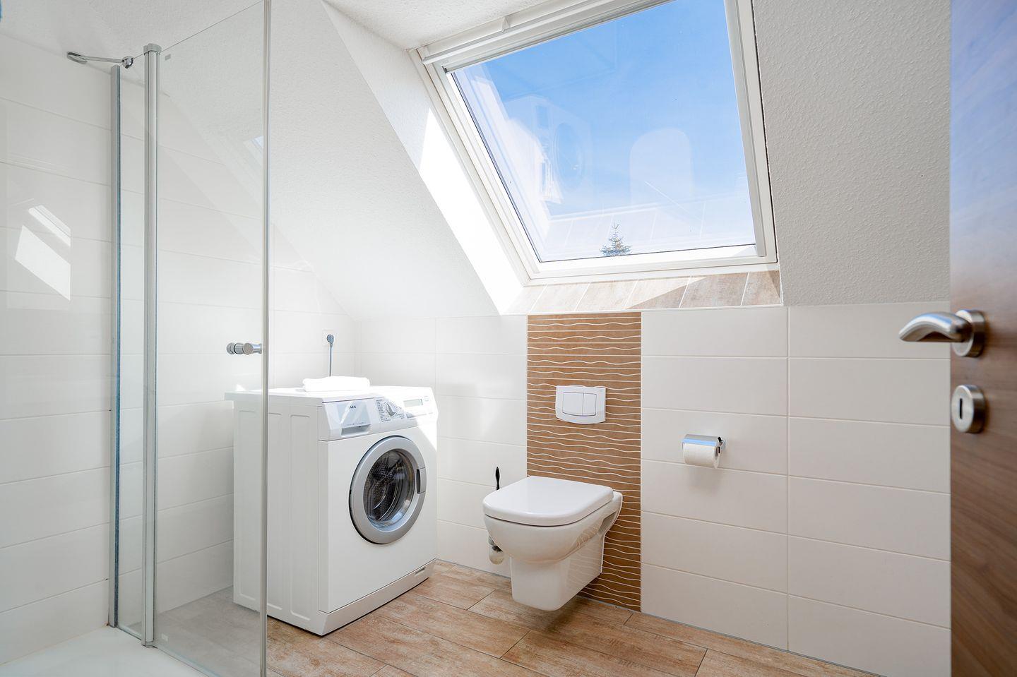 Im modernen Bad befindet sich die Dusche mit Regenbrause, Handtuchheizkörper, Waschtrockner, Radio und ein Föhn.