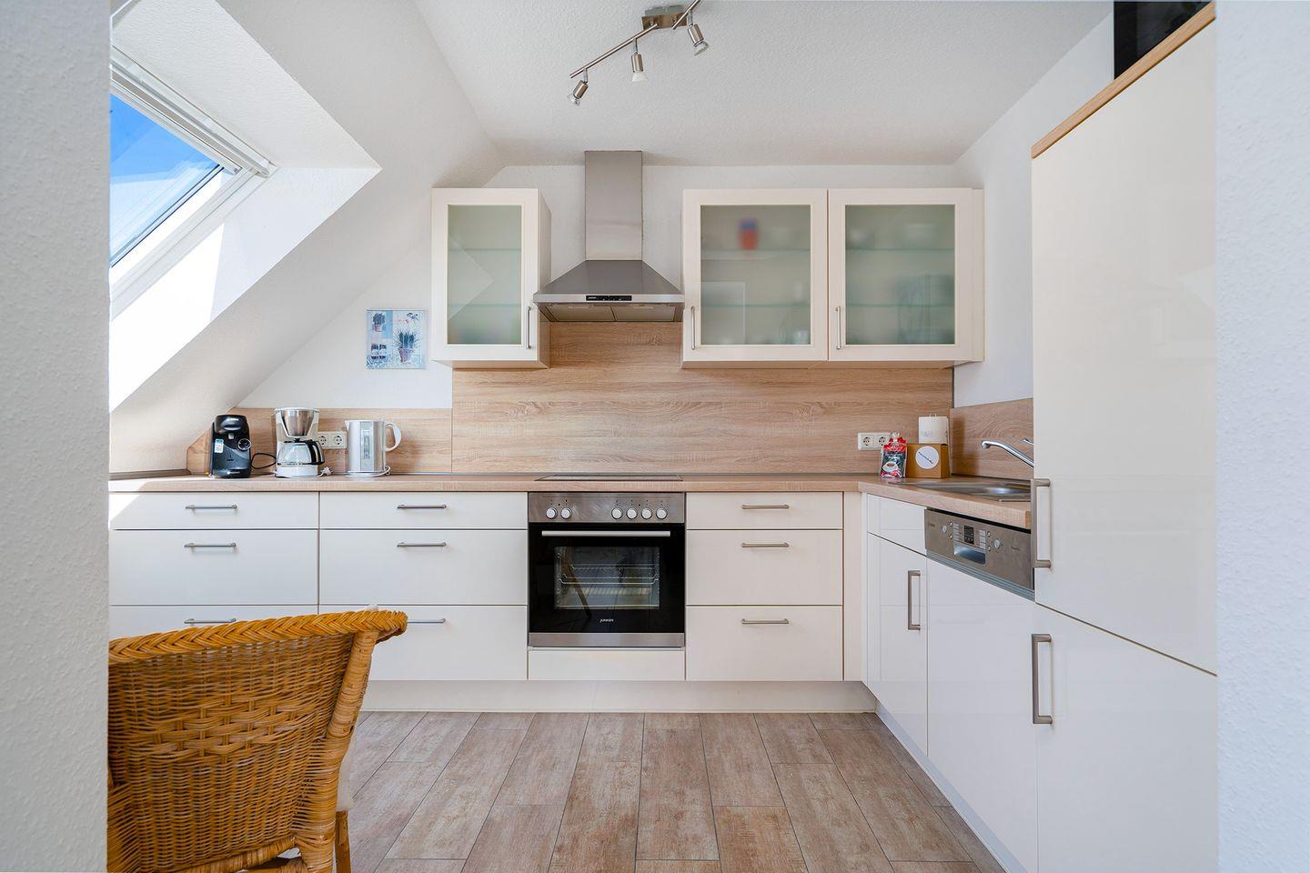 Angrenzend befindet sich die voll ausgestattete Küche mit E-Herd mit Ceranfeld, Geschirrspüler, Backofen, Kühlschrank mit Gefrierfach, Mikrowelle, Wasserkocher, Kaffeemaschine, Tassimo-Kaffeepadmaschine usw. Zwei Sitzplätze laden hier zum schnellen Kaffee zwischendurch ein.
