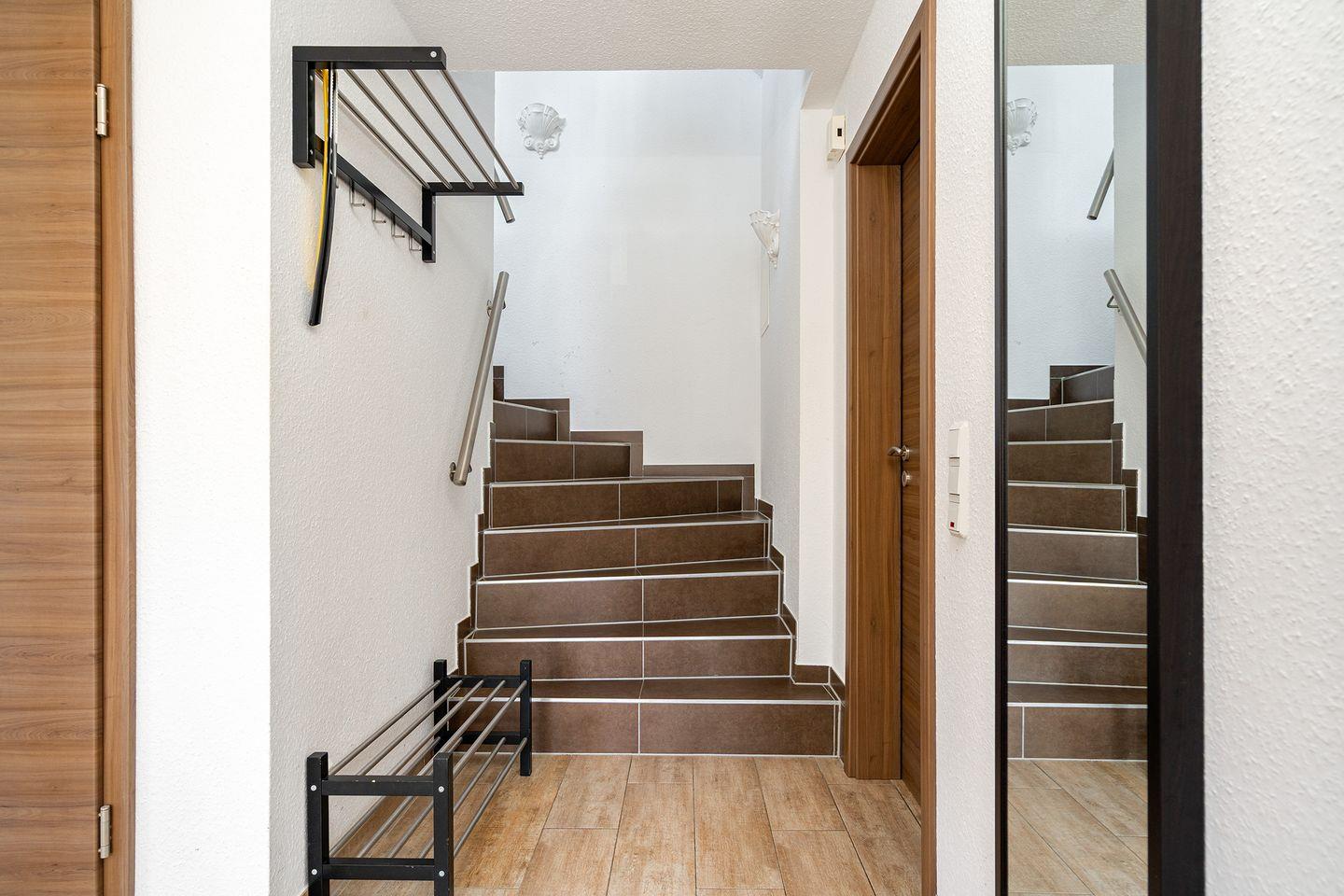 Alle Fenster sind entweder mit Plissees oder Rollos versehen. Der Boden ist trotz der Fliesen durch die weitgehende Rücklauferwärmung angenehm warm. Im Spitzboden ist Laminat verlegt.
