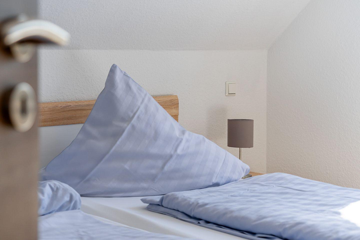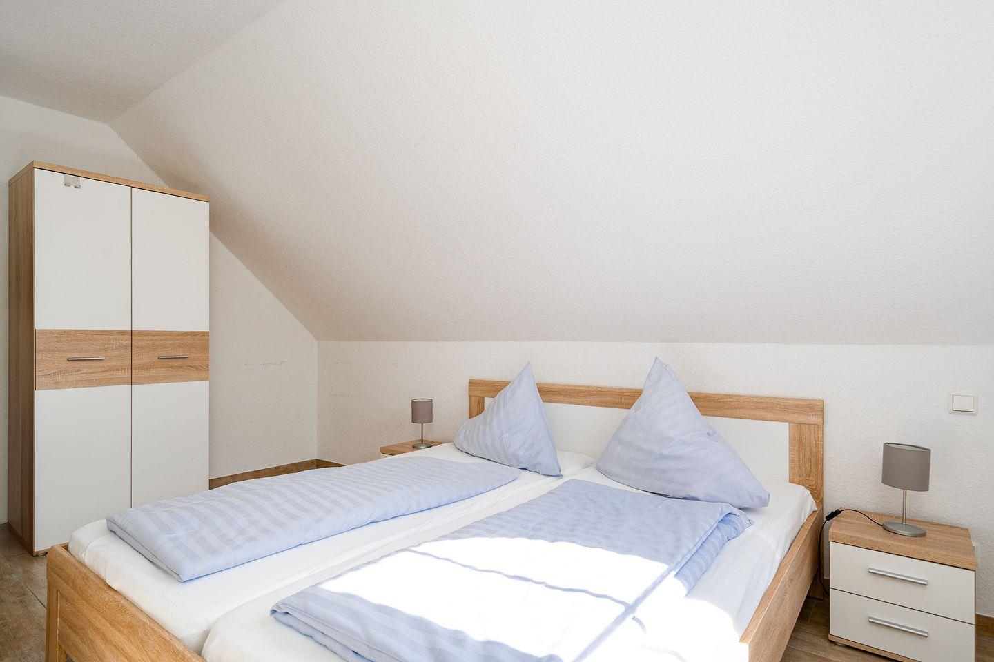 Das Schlafzimmer mit Doppelbett ist groß genug, um dort auch noch ein Babybett unterbringen zu können.