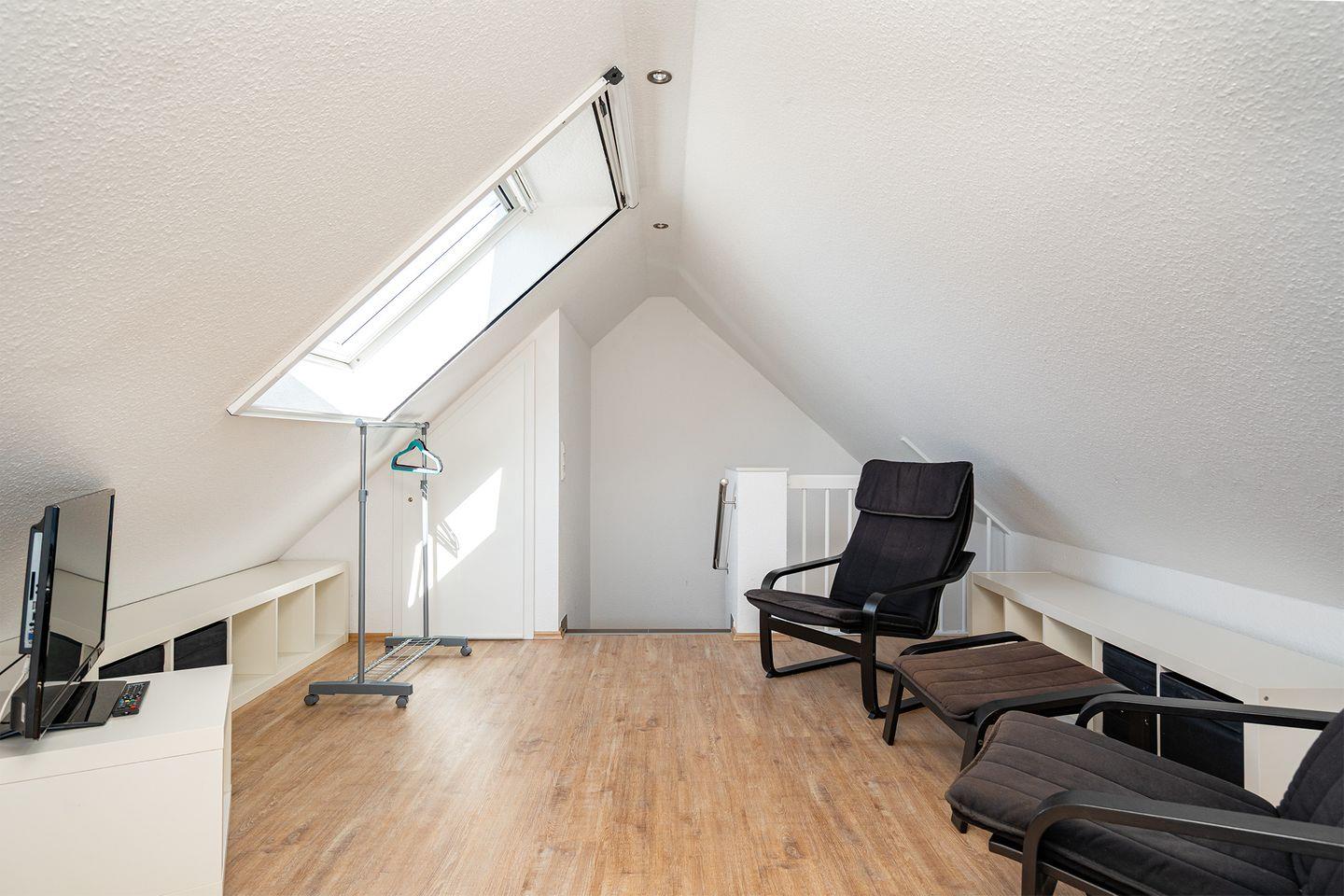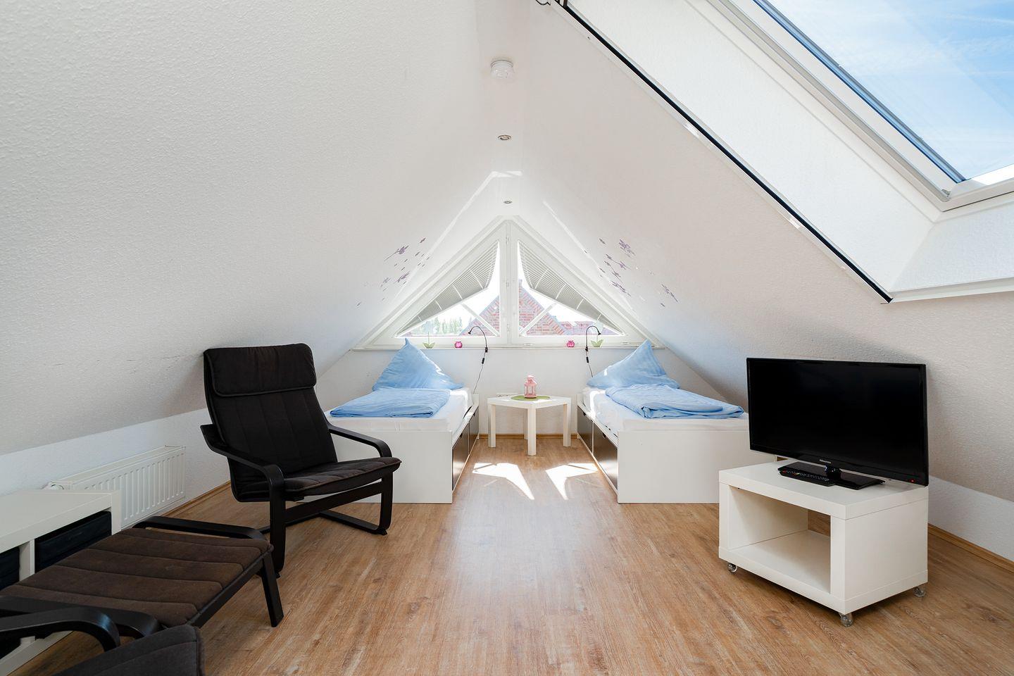Im ausgebauten Spitzboden gibt es zwei weitere Einzelbetten. Von hier aus kann man sogar bis zum Hafen sehen. Zwei Sessel sowie ein weiterer LCD-SAT-TV laden zum Relaxen ein.