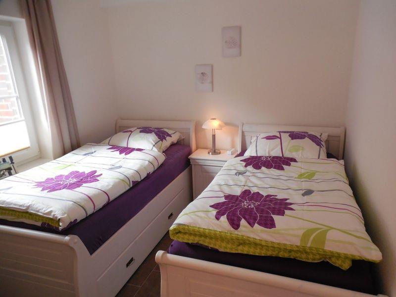 Es gibt zwei gemütliche Schlafräume, 1* mit Doppelbett (2 x 0,90m x 2,00m) und 1* mit zwei Einzelbetten (1,00m x 2,00m) mit einer 7-Zonen-Kaltschaummatratze. Zusätzlich sind alle Betten mit einem viskoelastischem Topper ausgestattet. Dieser erhöht den Schlafkomfort. Die Betten verfügen über eine Komforthöhe von 67 cm. Die Lattenroste sind beidseitig verstellbar. Die Schlafräume verfügen über Außenjalousien sowie Plissees. In jedem Schlafraum gibt es einen weiteren Fernseher. Das moderne Bad ist mit einer barrierefreien Dusche und WC, sowie einem Handtuchtrockner ausgestattet. Außerdem gibt es zusätzlich noch ein Gäste-WC.
