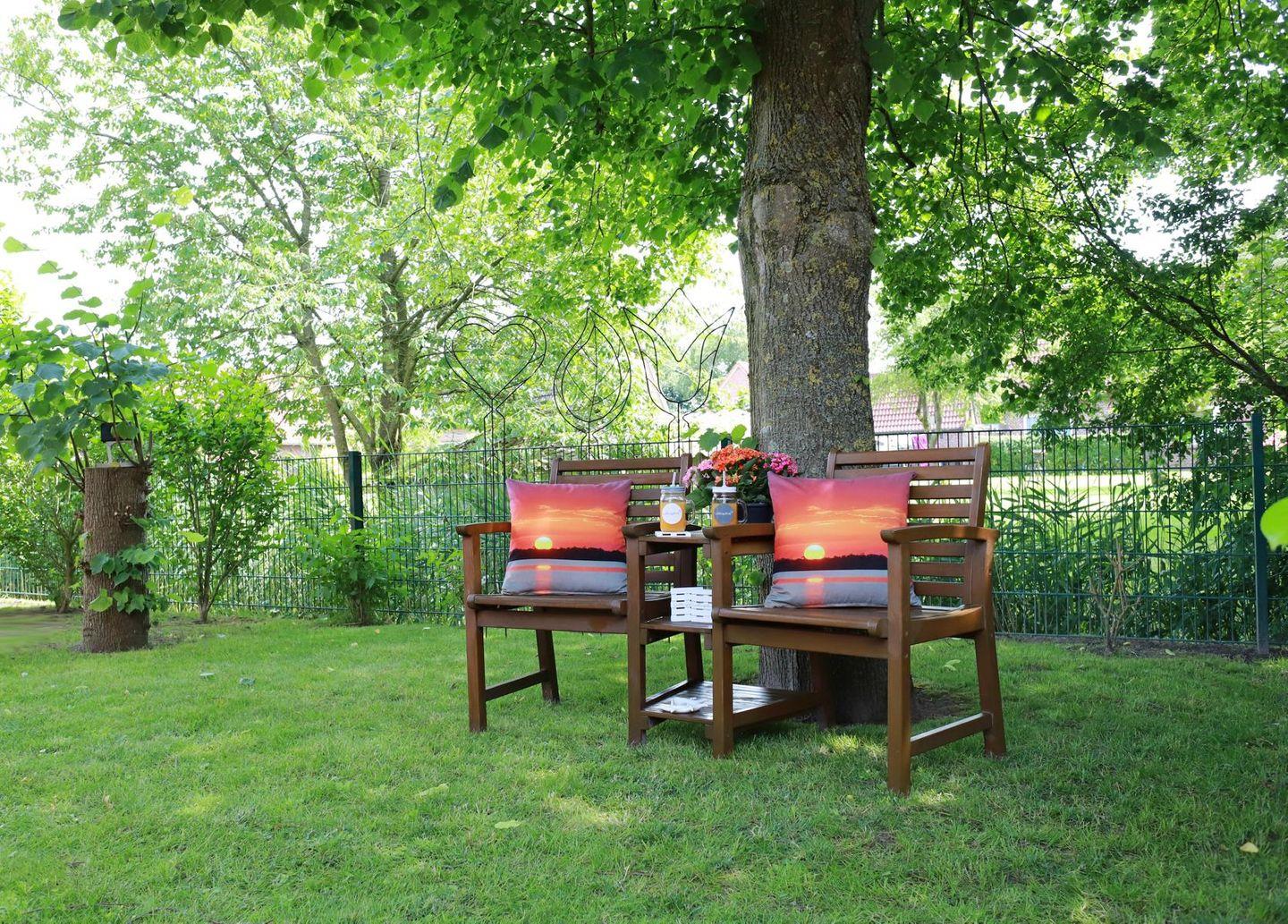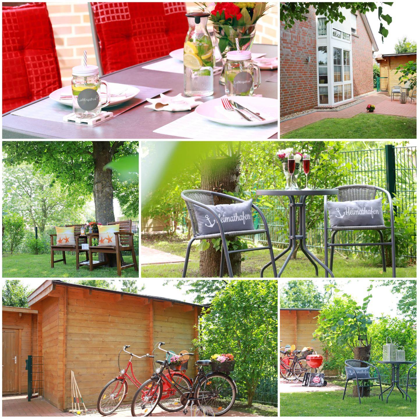 Ein abgeschlossener Garten mit 2 gemütlichen Terrassen (Süd- und Westseite), hochwertiger Kettler Sitzgruppe, großem Ampelschirm, Bank, Bistrotisch mit 2 Stühlen und Kugelgrill laden zu einem erholsamen Urlaub ein.