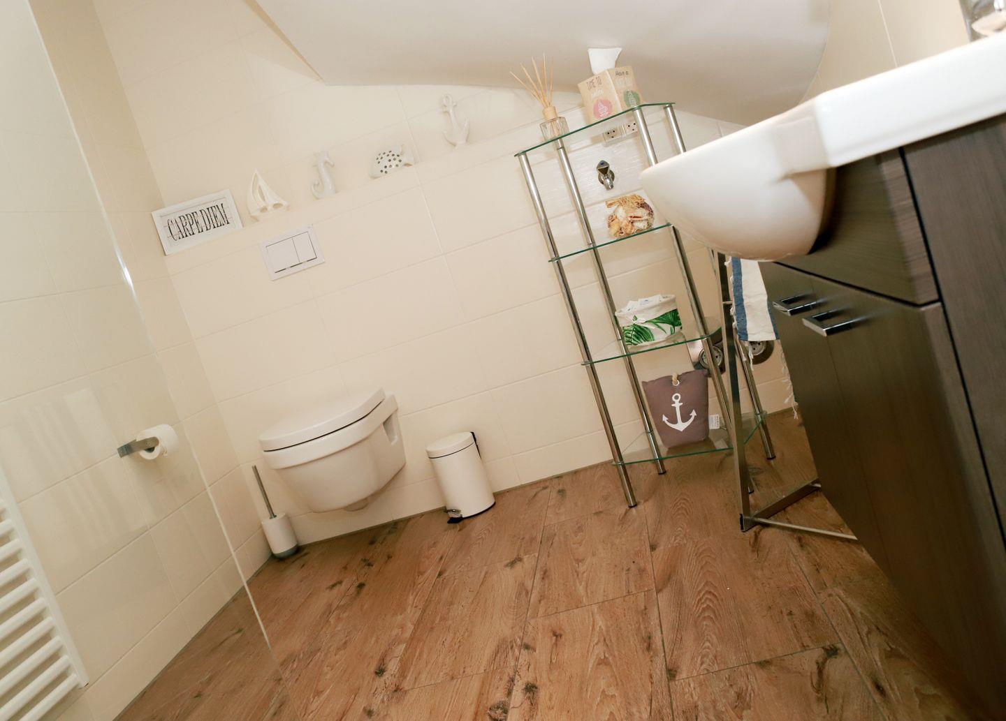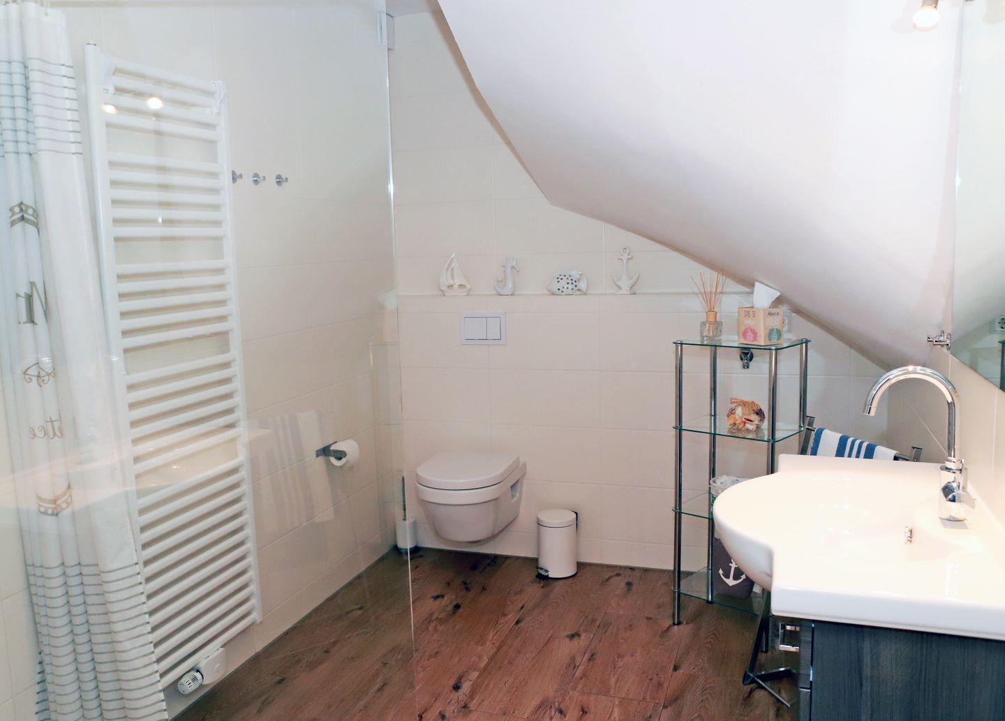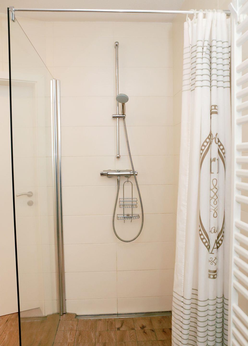 Das moderne Bad ist mit einer begehbaren/barrierefreien Dusche, WC, einem Handtuchtrockner (Badheizkörper), Fön und Bad-Hocker ausgestattet.