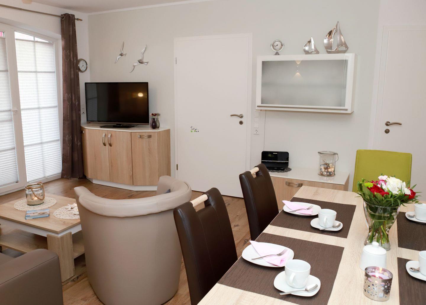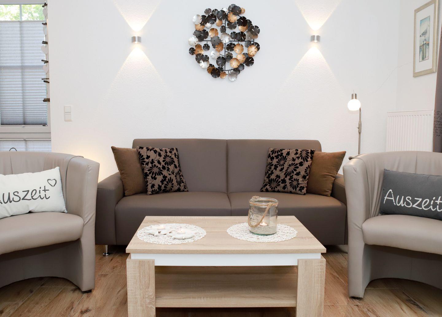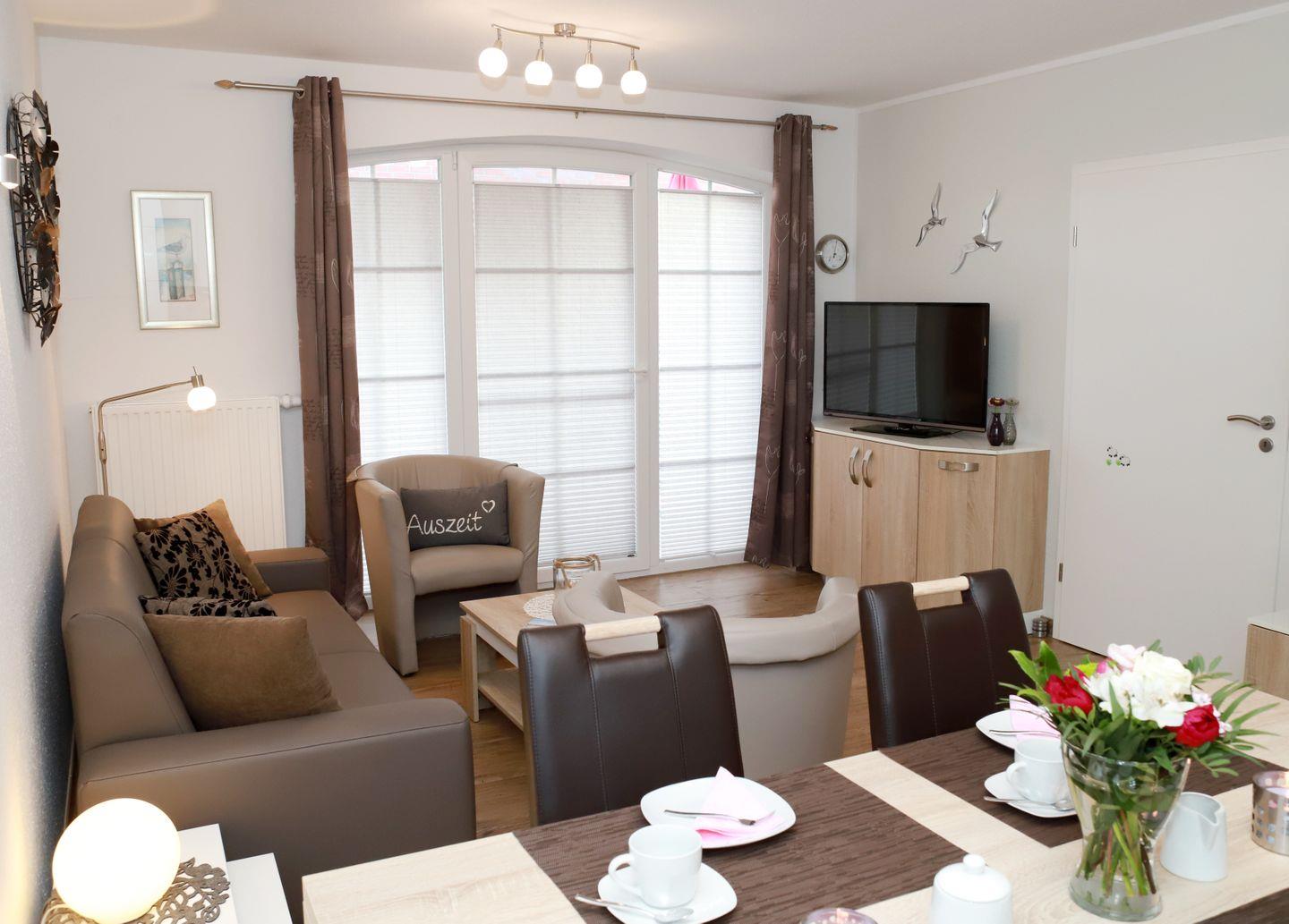 Ein gemütliches Sofa mit zwei Cocktailsesseln, ein großer Fernseher, eine Musik- und Radioanlage (USB Anschluss), verschiedene Bücher und Spiele sorgen für Entspannung und Unterhaltung.