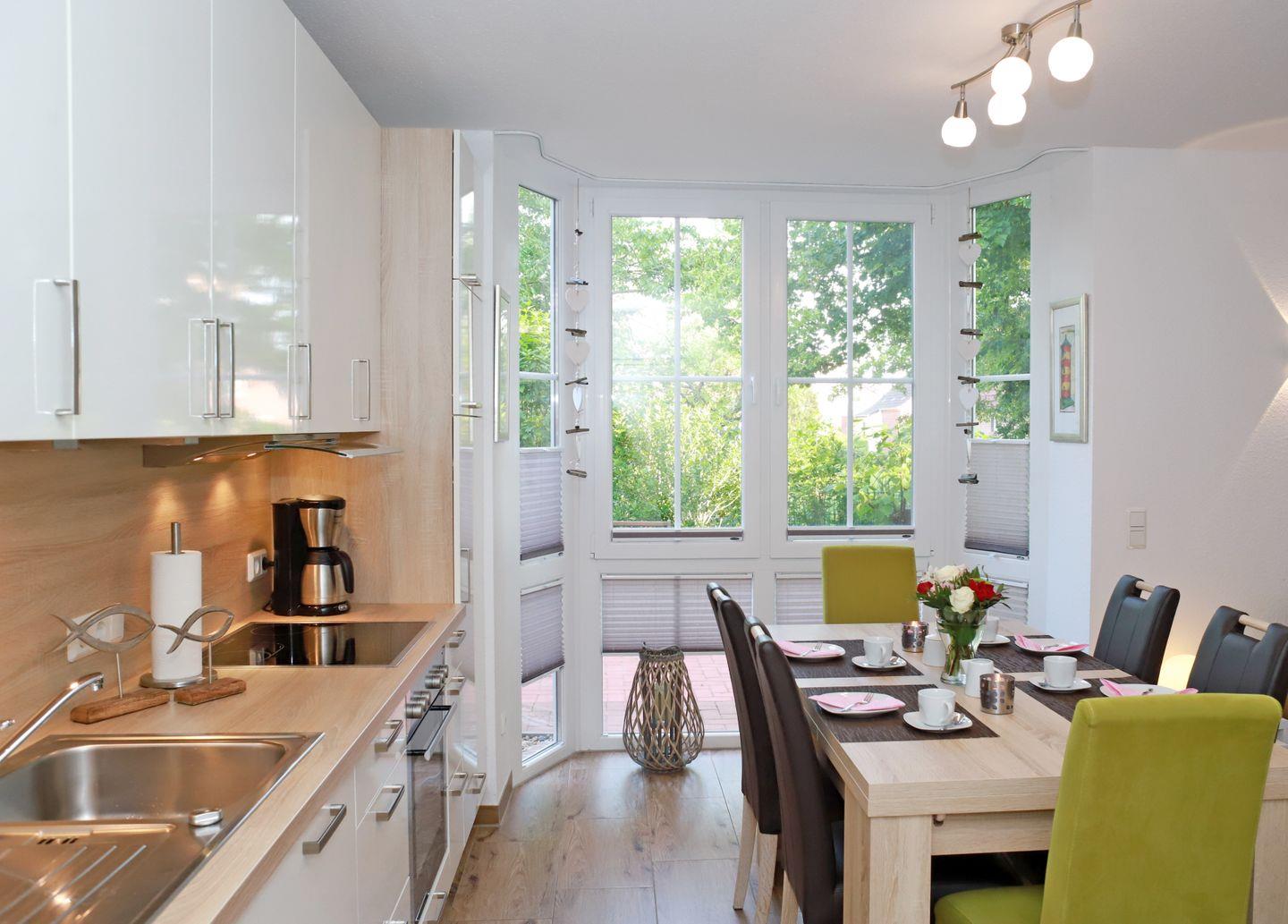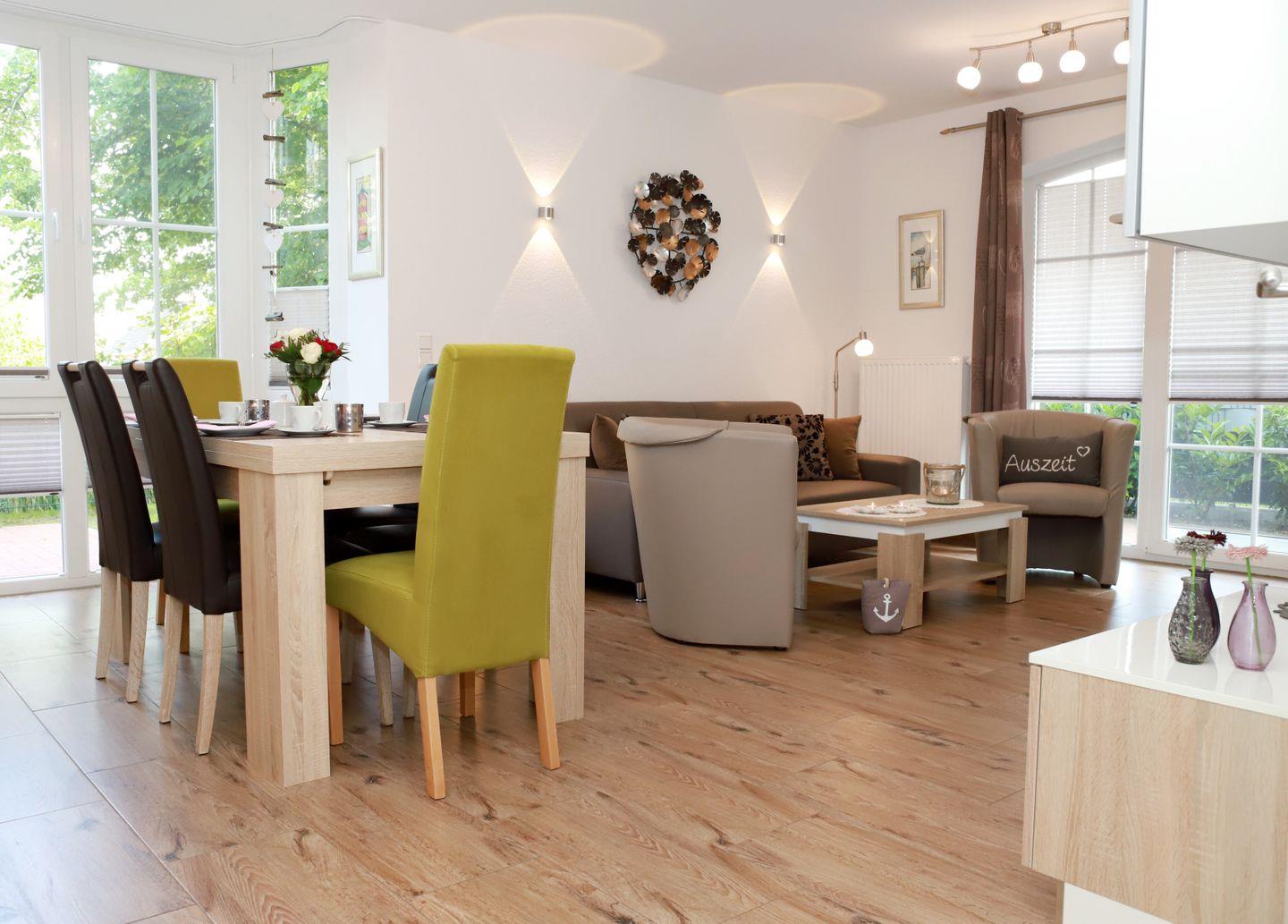 Im großzügigen Wohn- und Essbereich mit lichtdurchflutetem Erker werden auch Sie sich am Esstisch mit 6 bequemen Stühlen wohlfühlen und es bleiben keine Wünsche offen.