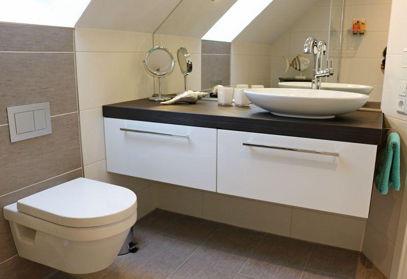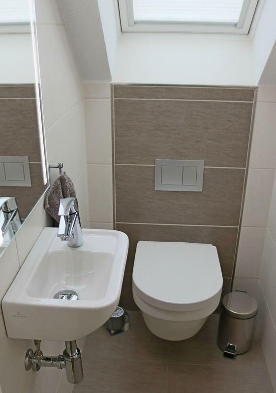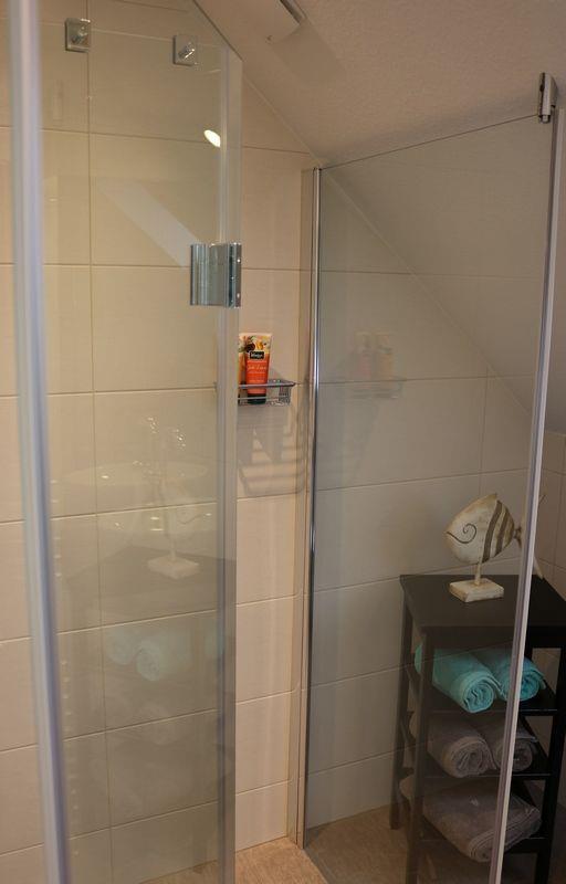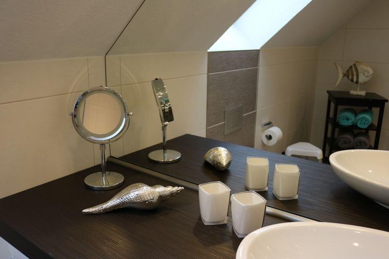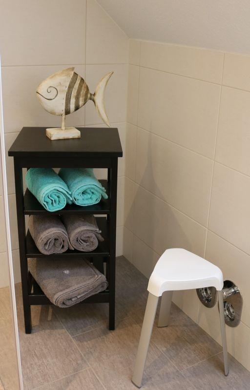Es gibt ein geräumiges modernes Bad mit barrierefreier Dusche (0,90 m x 1,20 m) und großem Waschtisch. Ein Handtuchtrockner, Kosmetikspiegel und Fön sind ebenfalls vorhanden. Ein zusätzliches WC ergänzt die komfortable Ausstattung.