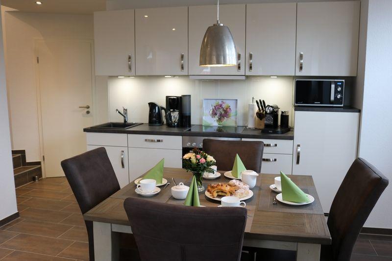 In der sich anschließenden offenen Einbauküche stehen viele Annehmlichkeiten wie Geschirrspüler, Cerankochfeld, Backofen mit Grillfunktion, Mikrowelle, Kühlschrank mit Gefrierfach, Wasserkocher, Toaster, Kaffeemaschine, Nespresso, Senseo, Raclette, Eierkocher, Küchenutensilien u. v. m. bereit. Im Glaserker rundet eine moderne Essgruppe mit ausziehbarem Tisch und 6 Stühlen das stimmungsvolle Interieur ab.