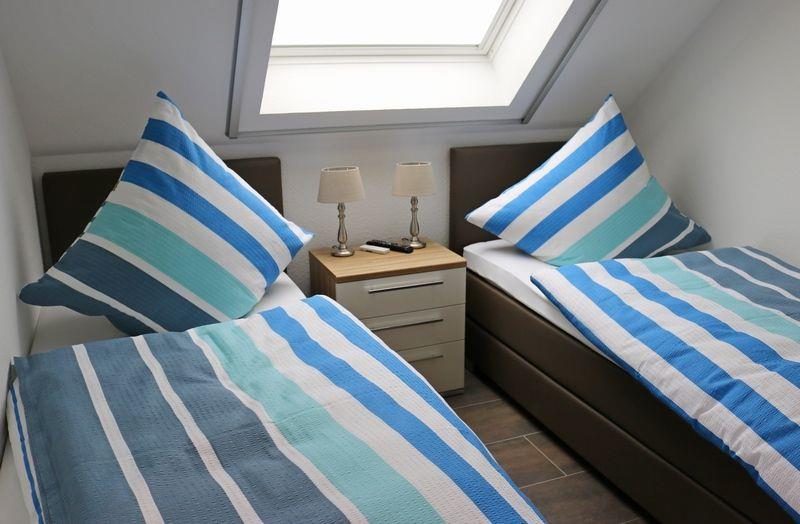 In den beiden Schlafzimmern sorgen top-aktuelle Boxspringbetten (1* 1,80 m x 2,00 m und 2* 0,90 m x 2,00 m) für traumhaften Schlafkomfort und ein großzügiger Kleiderschrank bietet viel Stauraum. Beide Schlafräume können abgedunkelt werden und sind zusätzlich mit einem Flachbildschirm-Fernseher ausgestattet.