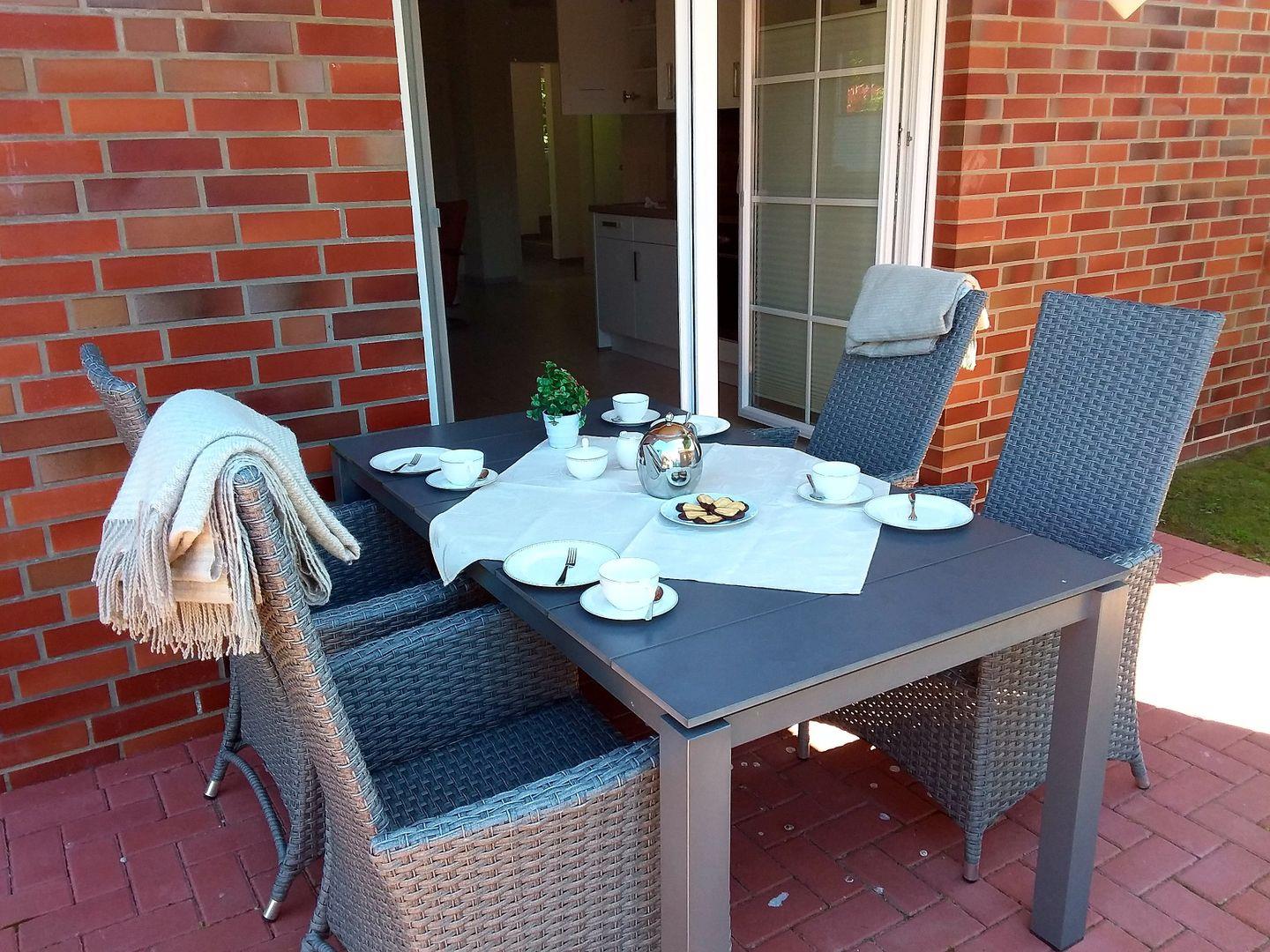 Ein kleiner, komplett eingezäunter Garten mit gemütlicher Terrasse, schicken Rattangartenmöbeln und Sonnenschirm, laden zu einem erholsamen Urlaub ein.