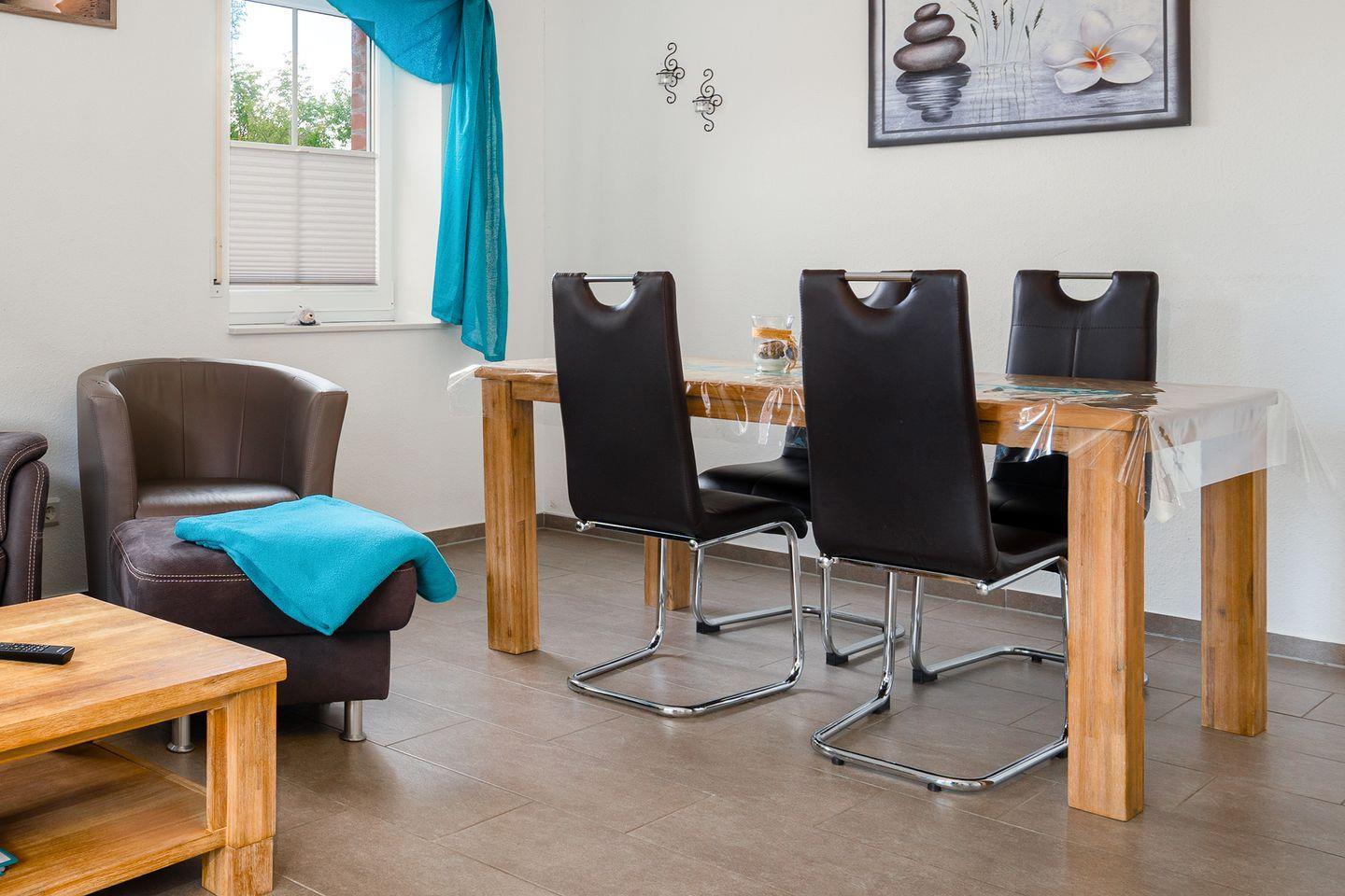 Großzügiger Wohn- und Essbereich mit SAT-TV, Radio. Vollausgestattete Einbauküche mit Ceranfeld, Backofen, Geschirrspülmaschine, Kühlschrank (kein Gefrierfach), Mikrowelle, Kaffeemaschine, Toaster, Wasserkocher usw. Hier befindet sich auch eine Fußbodenheizung. Ein Wäscheständer steht ebenfalls zur Verfügung.