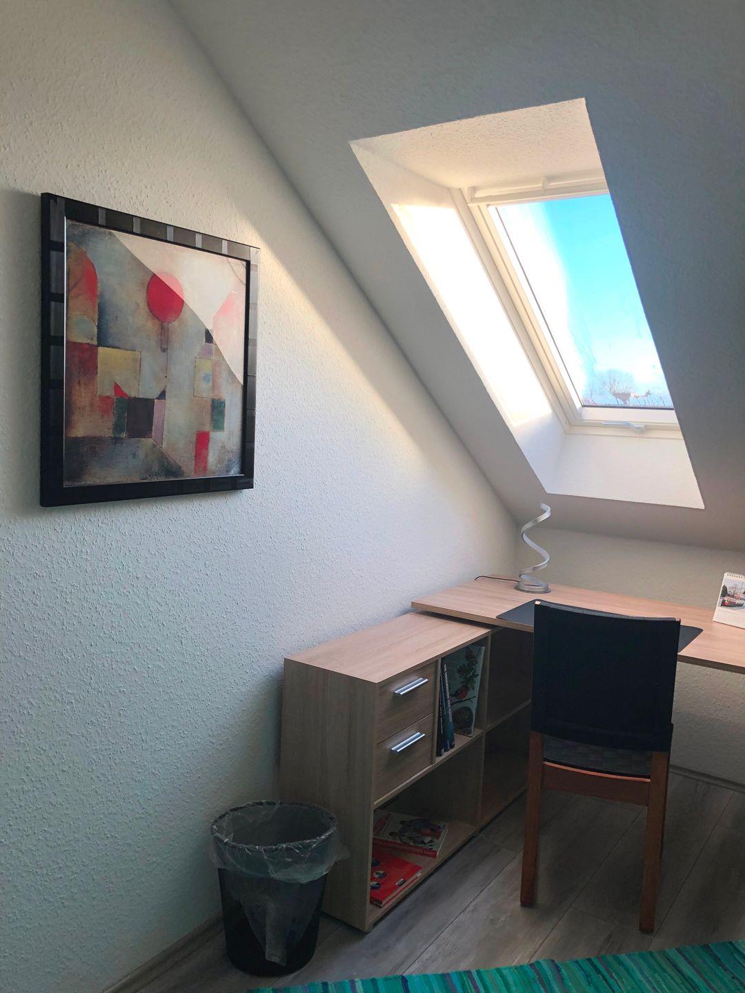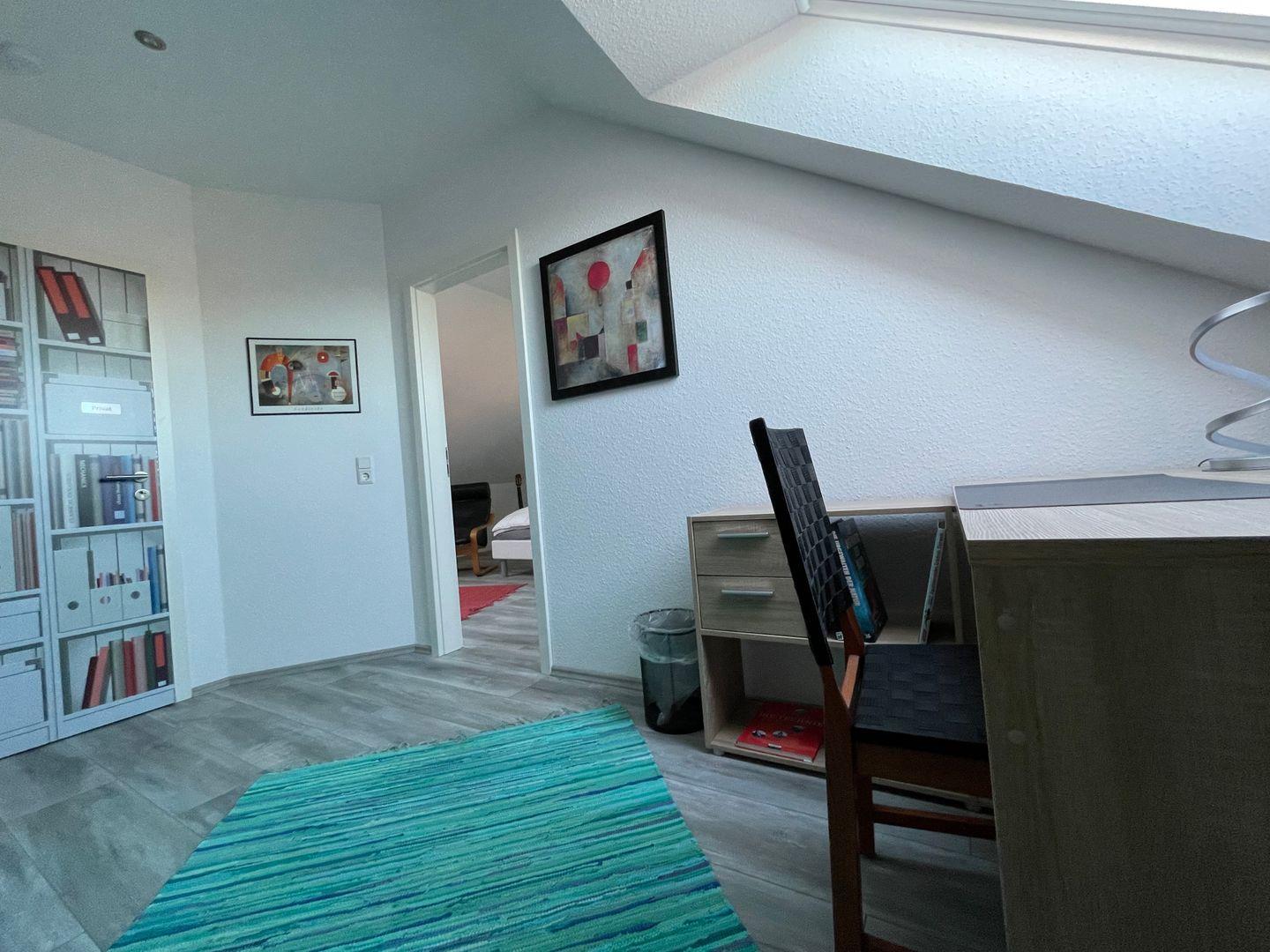 Vom Wohnbereich führt eine Treppe in eine kleine Galerie, mit Schreibtisch, Regal und einem Schlafplatz. Hier können Sie bei Bedarf Homeoffice mit Ihrem Urlaub vereinbaren.