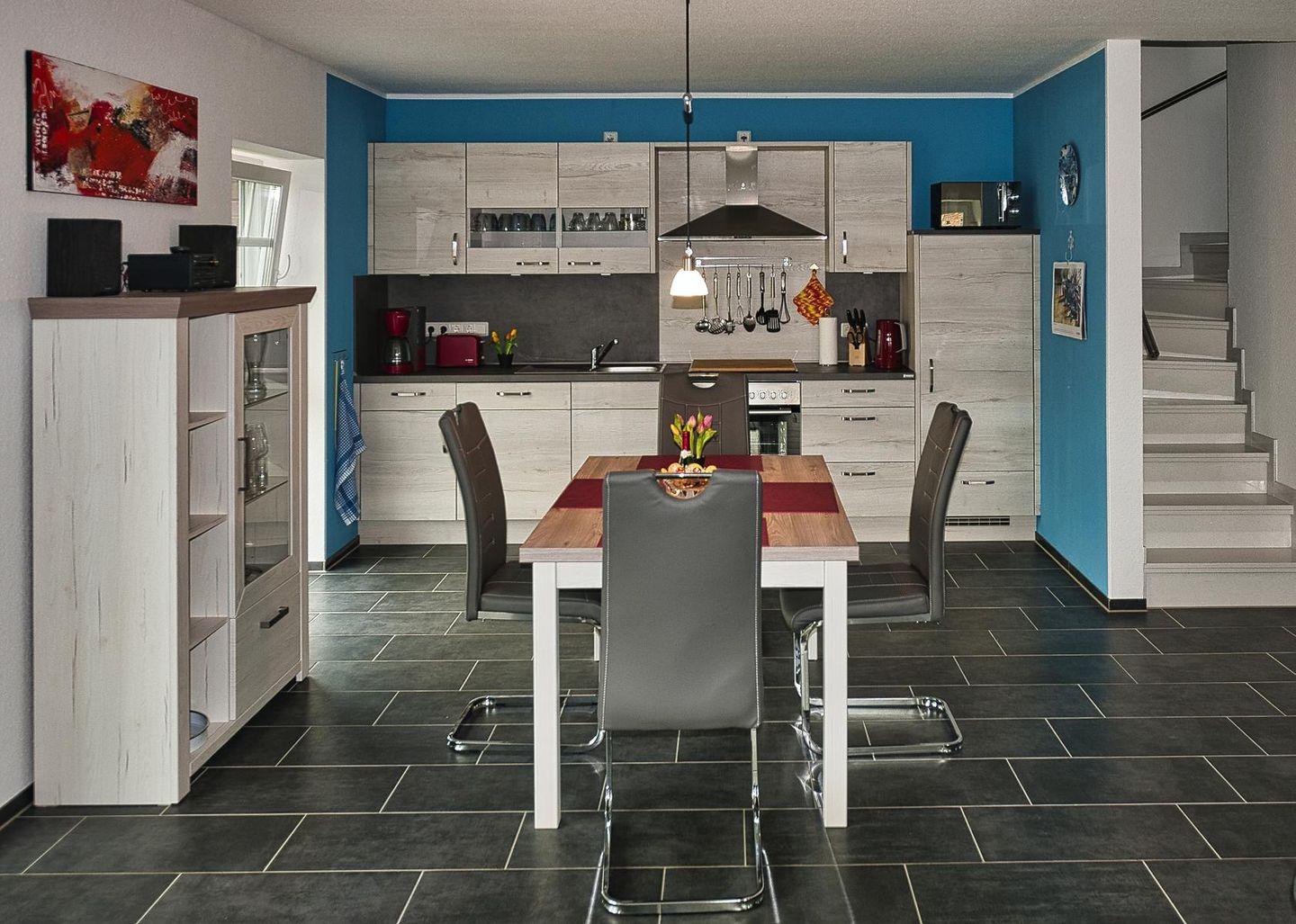 Die Küche ist komfortabel eingerichtet mit Spülmaschine, Mikrowelle, Kühlschrank mit Gefrierfach, Cerankochfeld, Umluftbackofen, Wasserkocher, Toaster, Eierkocher, Filterkaffeemaschine, Senseo-Padmaschine, Teebereiter, Stabmixer und Küchenhelfer.