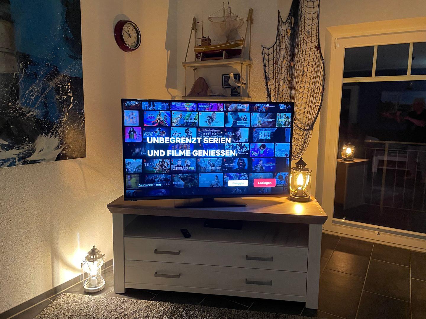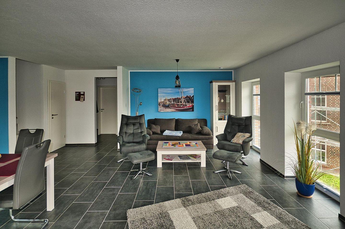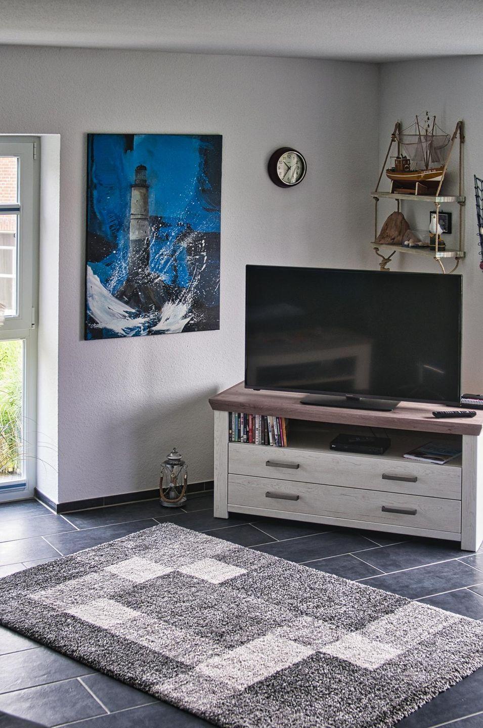 Der Eingangsbereich bietet Ihnen Platz für Garderobe und Schuhe und führt in einen großzügigen Wohn- und Essbereich, mit bodentiefen Fenstern und maritimen Flair. Dieser ist mit einem bequemen Sofa und 2 Relaxsesseln incl. Fußhockern ausgestattet. Für Ihre Unterhaltung stehen ein 50 Zoll 4K-HDR, LED Bildschirm mit Internet/Smart TV, einem Blu-ray/DVD Player, Stereoanlage, diverse Spiele, Hörbücher, DVDs, CDs und Lesestoff zur Verfügung.