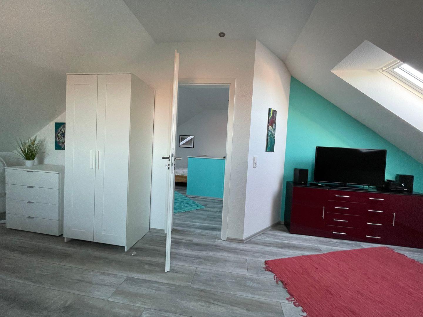 Durch Wand und Tür getrennt ist ein weiteres großzügiges Schlafzimmer mit 2 Einzelbetten, 2 Lederschwingsesseln, Internet/Smart TV, Stereoanlage, Kleiderschrank und Kommode, vorhanden.