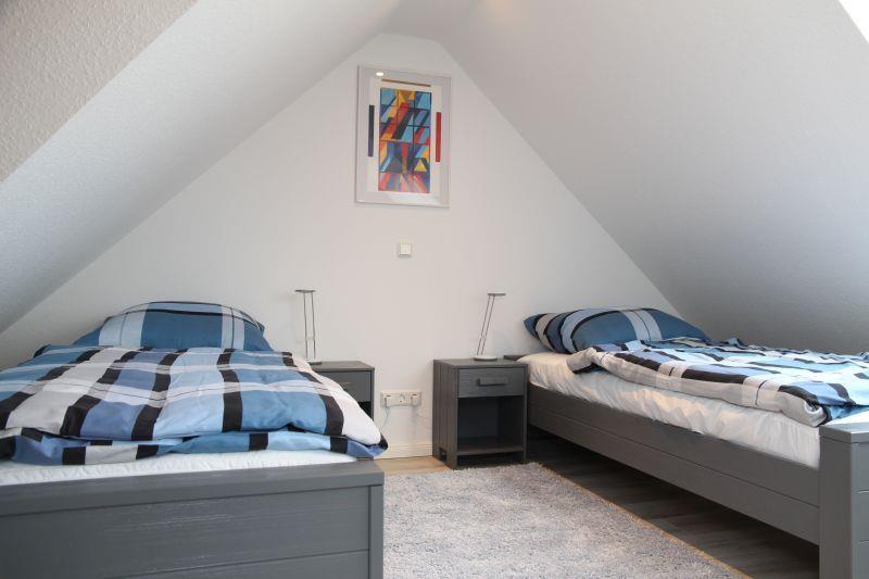 Das Ferienhaus (Nichtraucher) verfügt über 3 Schlafzimmer (Schlafzimmer 1 mit Doppelbett + Schlafzimmer 2 mit 2 Einzelbetten, die sich auf der ersten Etage befinden und das 3. Schlafzimmer befindet sich in der ausgebauten Galerie unterm Dach mit weiteren 2 Einzelbetten). In den Schlafzimmern 1 und 2 gibt es jeweils einen weiteren Fernseher. Die Veluxfenster in den beiden Schlafräumen 2 und 3 verfügen über Verdunkelungsrollos. Das Schlafzimmer 1 mit Doppelbett verfügt über Außenjalousien.