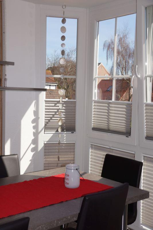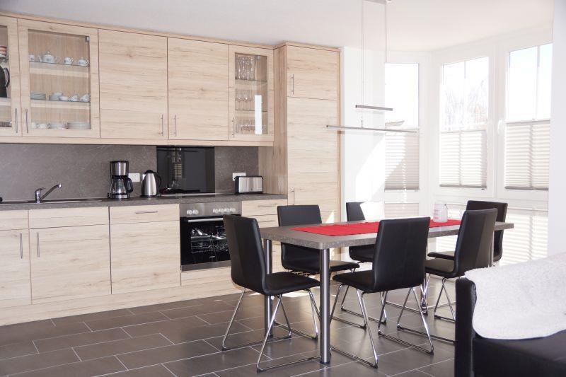 Die große Küche, mit Erker, ist ausgestattet mit einer Geschirrspülmaschine, einem Kühlschrank mit Gefrierfach, Backofen, Mikrowelle, Kaffeemaschine, Senseo-Pad-Maschine, Wasserkocher und sogar ein Teegeschirr, für die gemütliche Tasse Ostfriesentee, ist vorhanden. Am Esstisch finden 6 Personen bequem Platz.