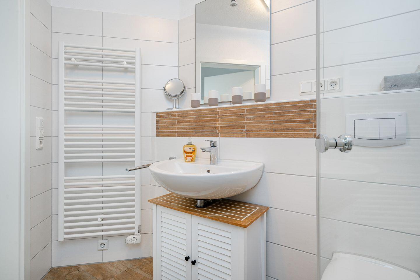 Ein Dusch-Bad (barrierefrei), Fön und Waschmaschine und ein Gäste-WC gehören ebenfalls zur gehobenen Ausstattung.