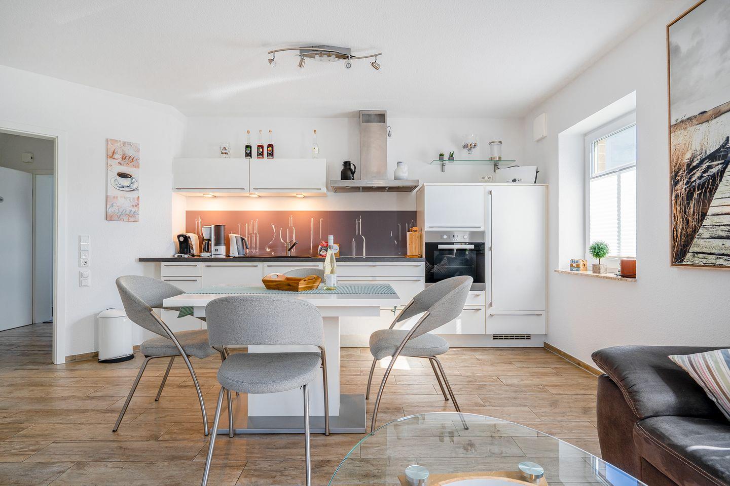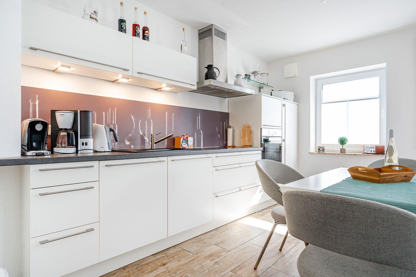 Großer Wohn-/Essbereich mit voll ausgestatteter Küche z. B. Mikrowelle, Backofen, Spülmaschine, Induktionsherd, Kühlschrank mit Gefrierfach, Cafissimo (Tchibo), Kaffeemaschine, Toaster, Wasserkocher, u.v.m.