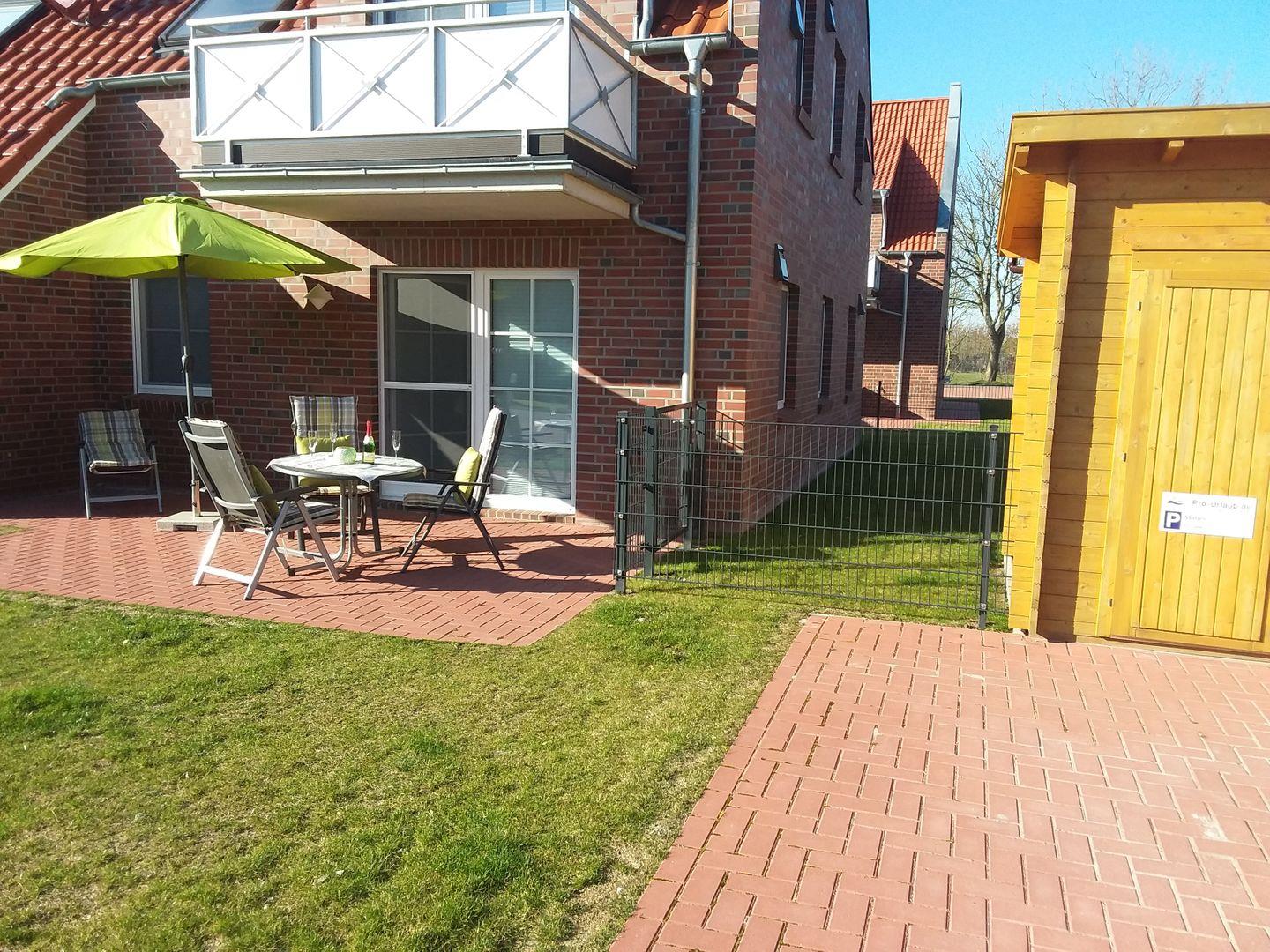 Ein kleiner Garten mit gemütlicher möblierter Terrasse und Sonnenschirm steht Ihnen für Sonnenstunden zur Verfügung.