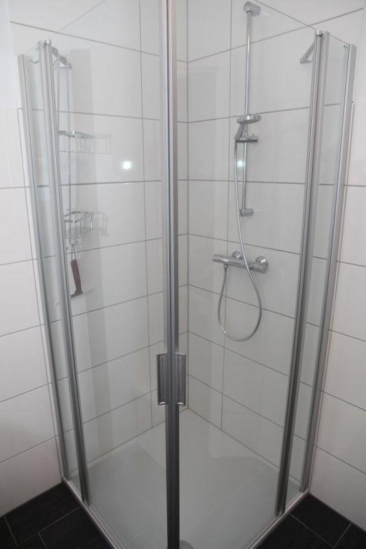 Das moderne Bad ist mit barrierefreier Dusche ausgestattet, ein Fön ist auch vorhanden.