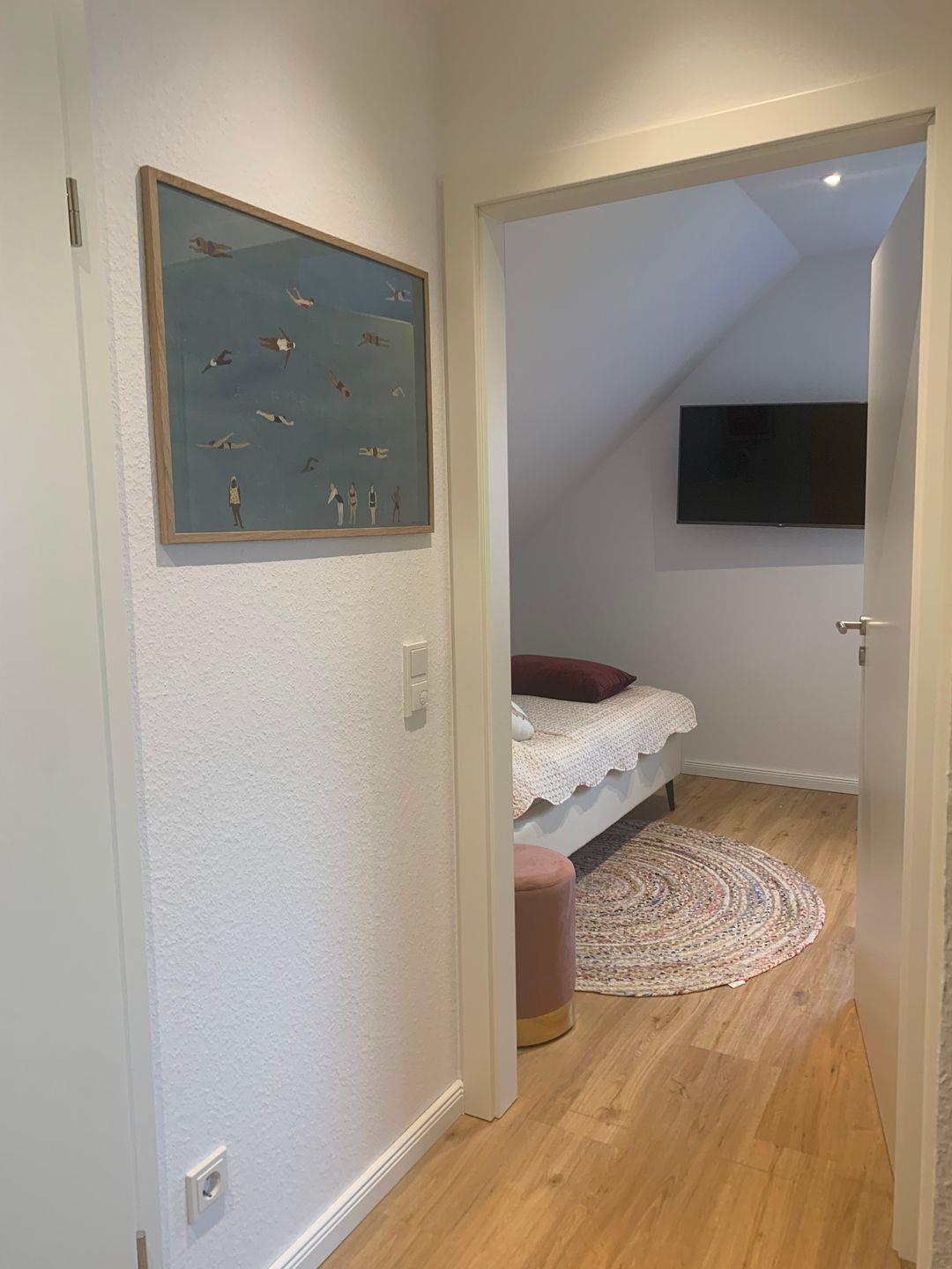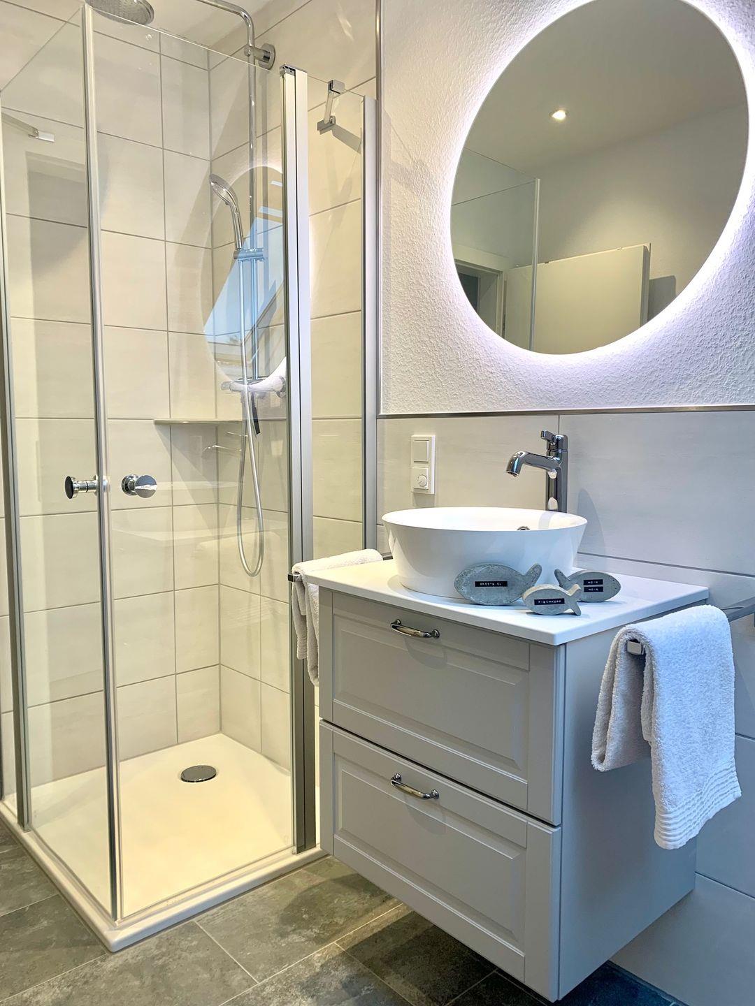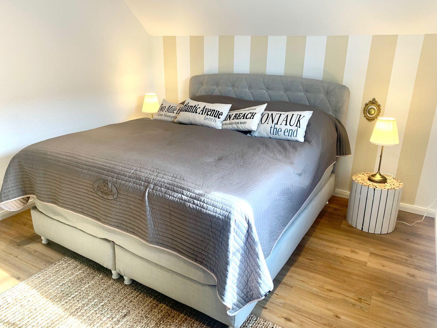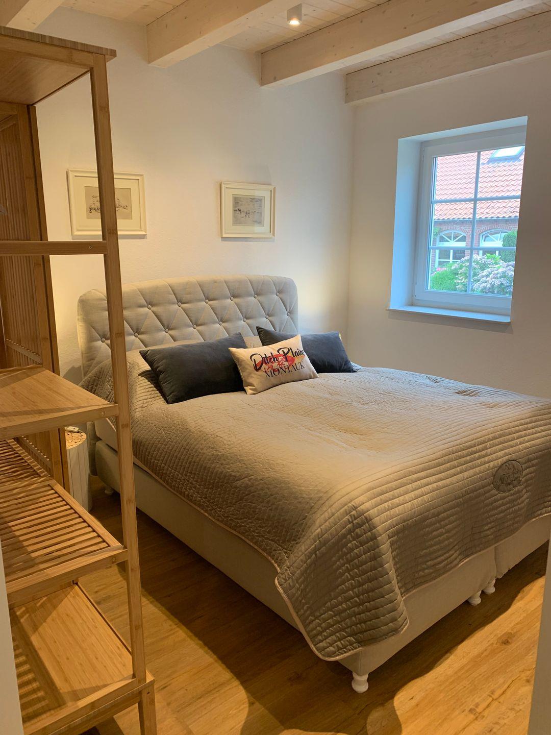 Ein Schlafzimmer und ein Badezimmer runden das Raumangebot im Erdgeschoss ab. Das moderne Bad überzeugt mit viel Platz, einer ebenerdigen, großen Rainshower-Dusche und einer Sauna, selbstverständlich finden Sie hier auch einen Fön. Im Schlafzimmer erwartet Sie ein bequemes Boxspringbett (1,60 x 2m) mit schönem Blick aufs Meer(bild) und einen offenen Kleiderschrank.