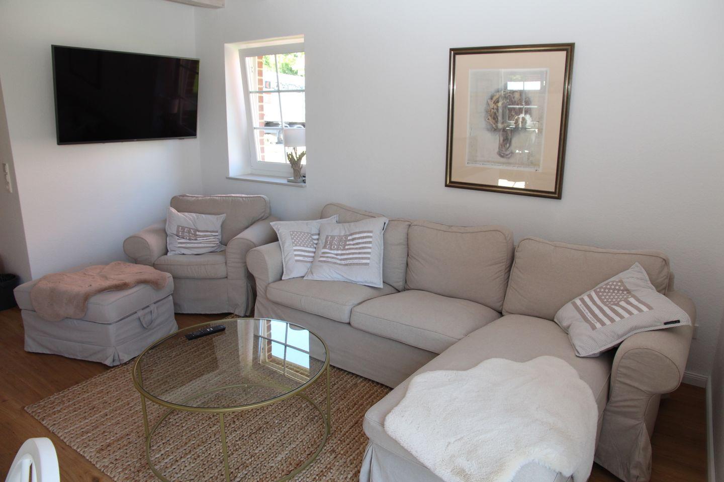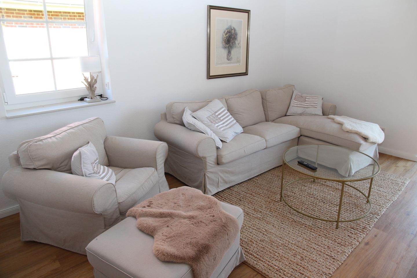 Im angrenzenden lichtdurchfluteten Ess- und Wohnbereich finden Sie einen runden Esstisch, an dem Sie mit bis zu 6 Personen Platz nehmen können und eine großzügige Sitzlandschaft mit modernem Flachbildfernseher. Die hell lasierte Holzdecke, indirekte Beleuchtung und ein moderner Eckkamin sorgen hier für elegante Gemütlichkeit. Hier können Sie nach dem Deichspaziergang oder dem Saunagang stilvoll entspannen und in der kalten Jahreszeit für wohlige Wärme sorgen.